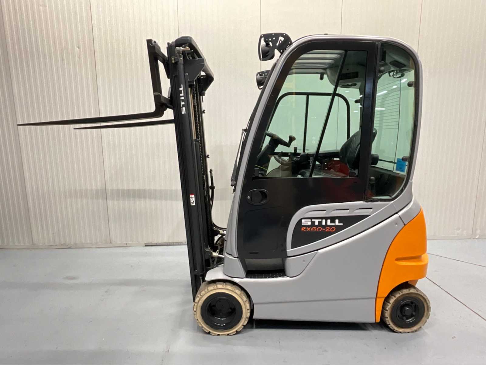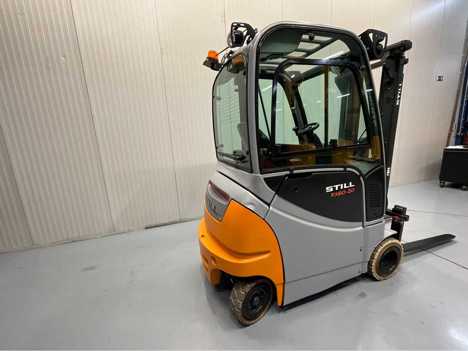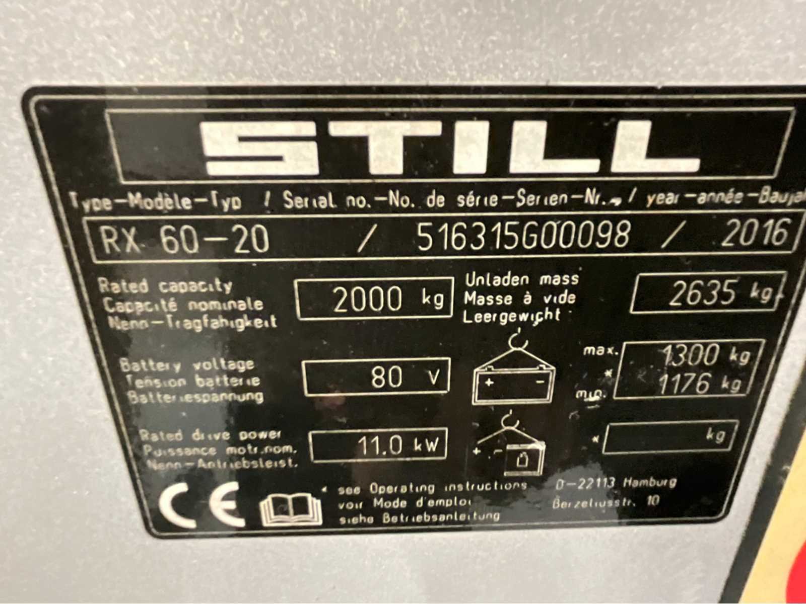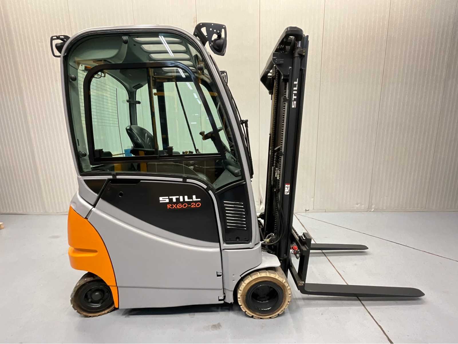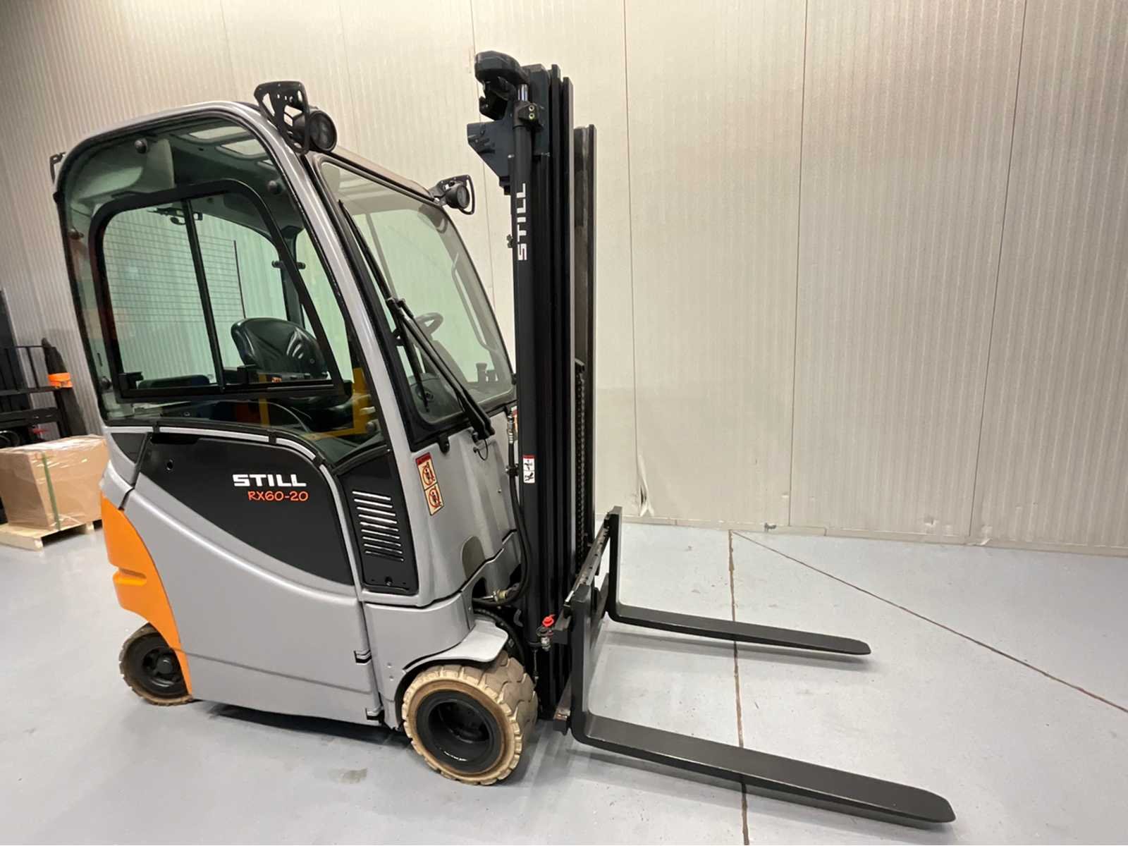 Buespot, gesloten cabine, 3e en 3e functie, non marking banden Merk: Still Type: RX60-20 Bouwjaar: 2016 Serienummer: 516315G00098 Brandstof: Elektrisch Soort band: Non marking Aantal wielen: 4 Free-lift: true Triple mast: true Eigen gewicht: 3935kg Hefvermogen: 2000kg Lepellengte: 1100mm Max. hefhoogte: 5100mm Hefhoogte: 5100mm Vol rubber banden: true Minimale doorrijhoogte: 2300mm Totale afmeting L: 3300mm Totale afmeting Breedte: 1150mm Totale afmeting Hoogte: 2300mm