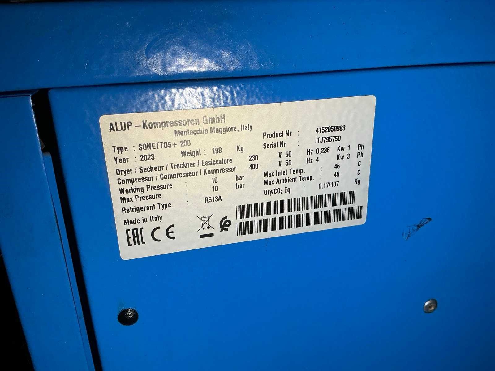 Merk: Alup Type: Sonetto S+ 200 Bouwjaar: 2023 Serienummer: ITJ795750 Capaciteit.: 10bar Vermogen: 4kW Buffertank inhoud: 200l Luchtdroger: true Aansluiting: 400V Totale afmeting L: 1350mm Totale afmeting Breedte: 600mm Totale afmeting Hoogte: 1300mm