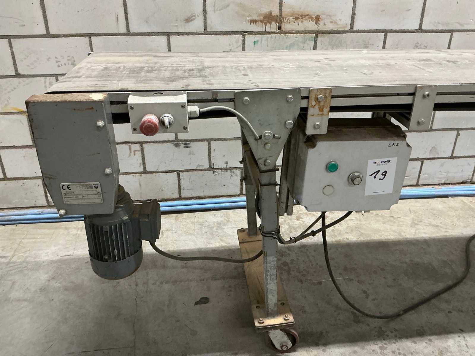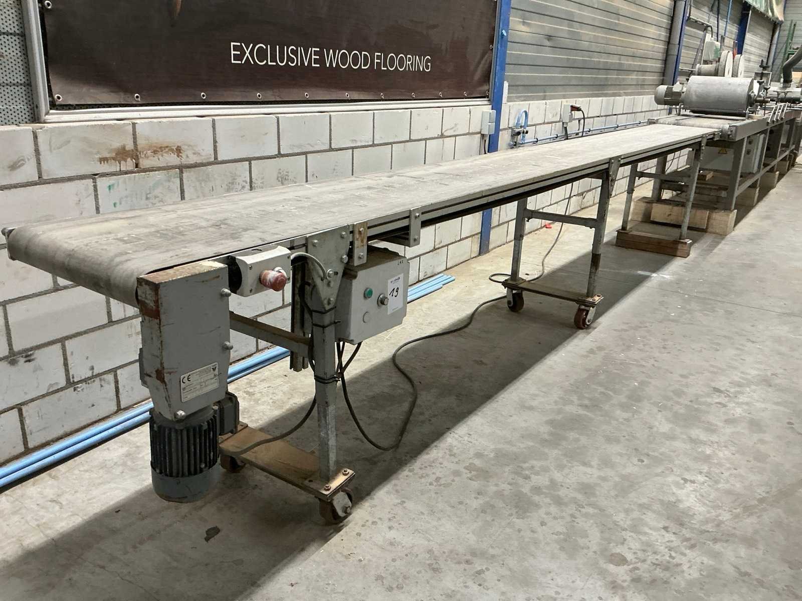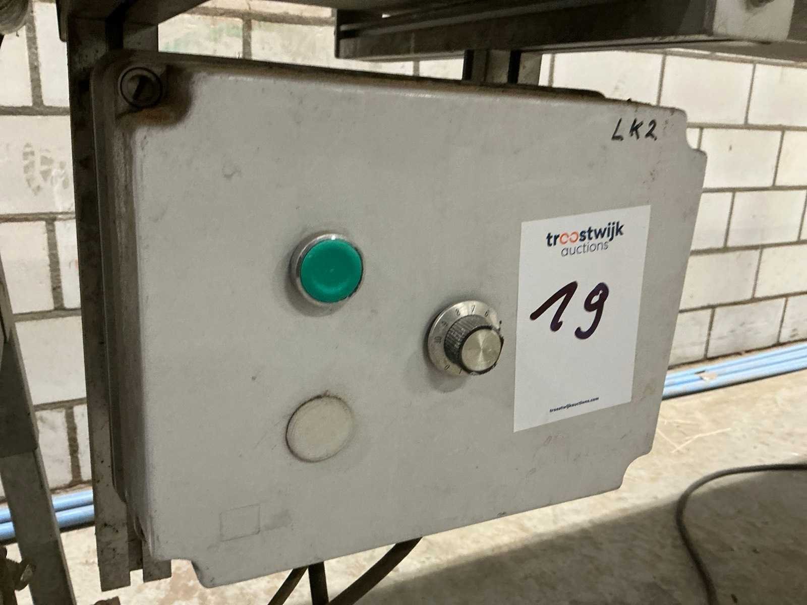 In hoogte verstelbaar; verrijdbaar; 230 Volt; capaciteit 120 kg; toerental regelbaar. Merk: Visser Type: Vikon Bouwjaar: 2000 Serienummer: 21689 Afmeting l: 5000mm Afmeting b: 450mm Afmeting h: 870mm Vermogen: 0.37kW