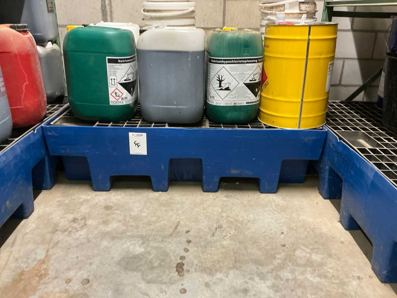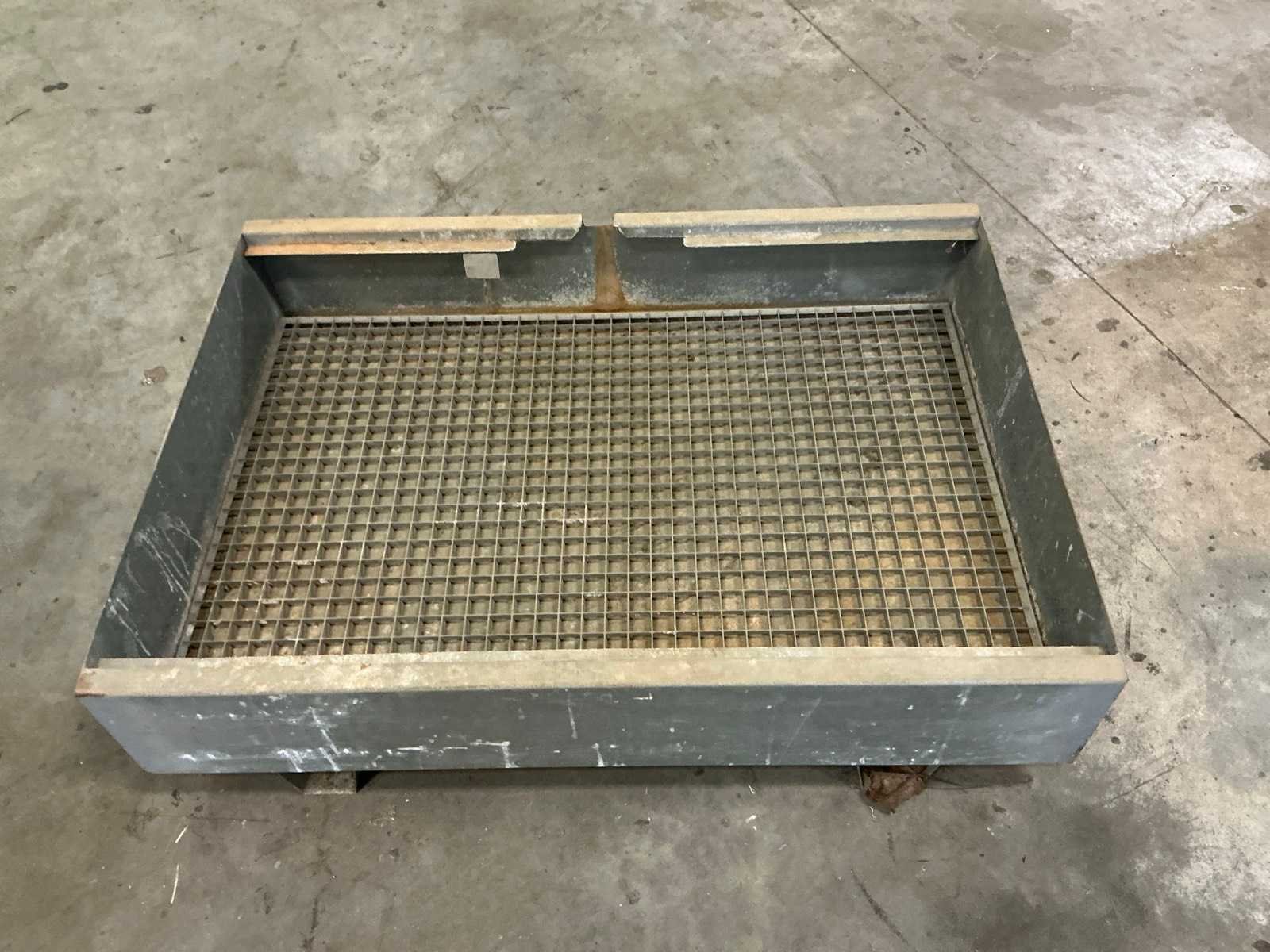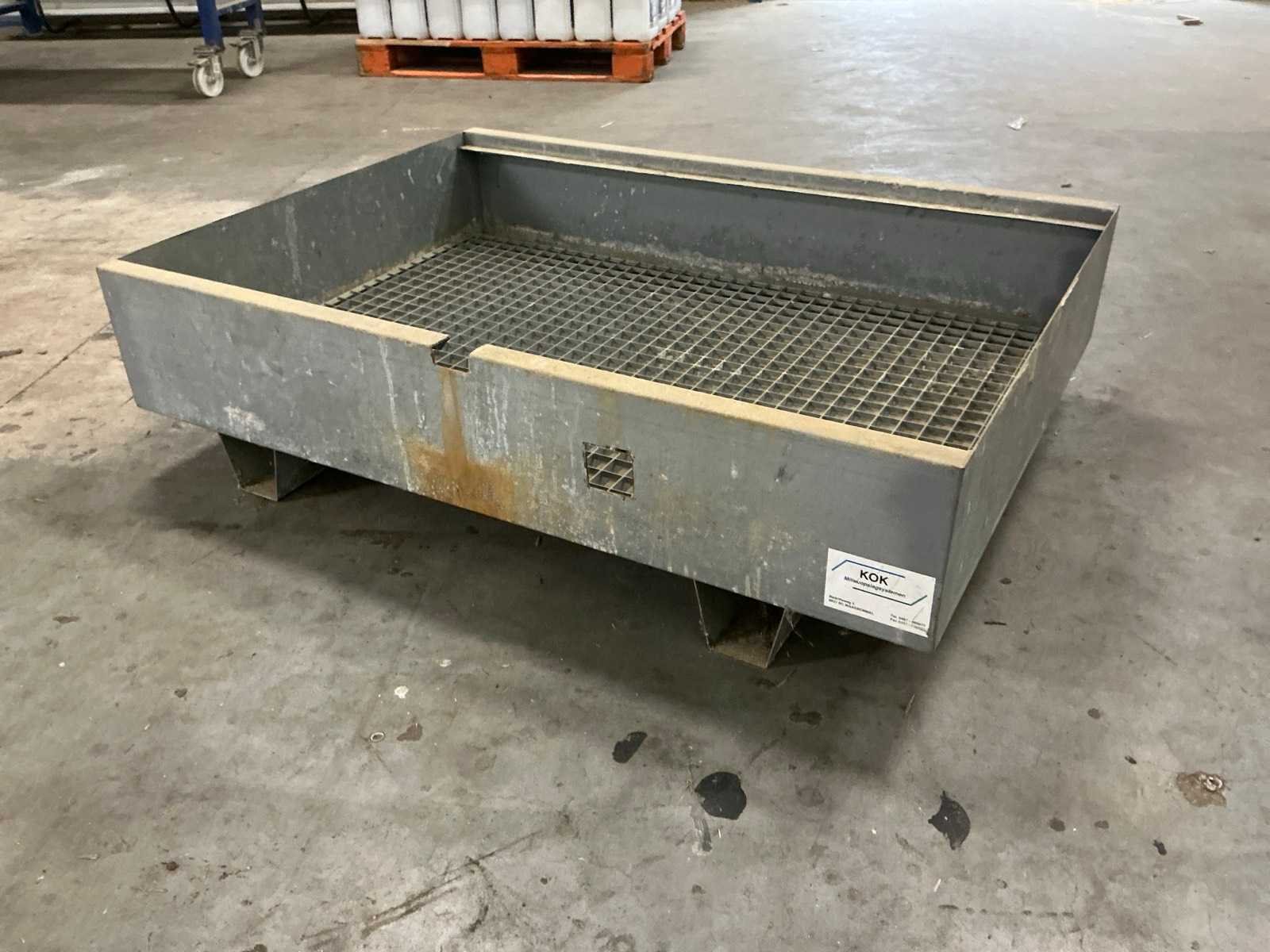 3x kunststof lekbak 122x83x33 cm; 1x stalen lekbak; let op items op de lekbakken behoren niet tot het kavel.