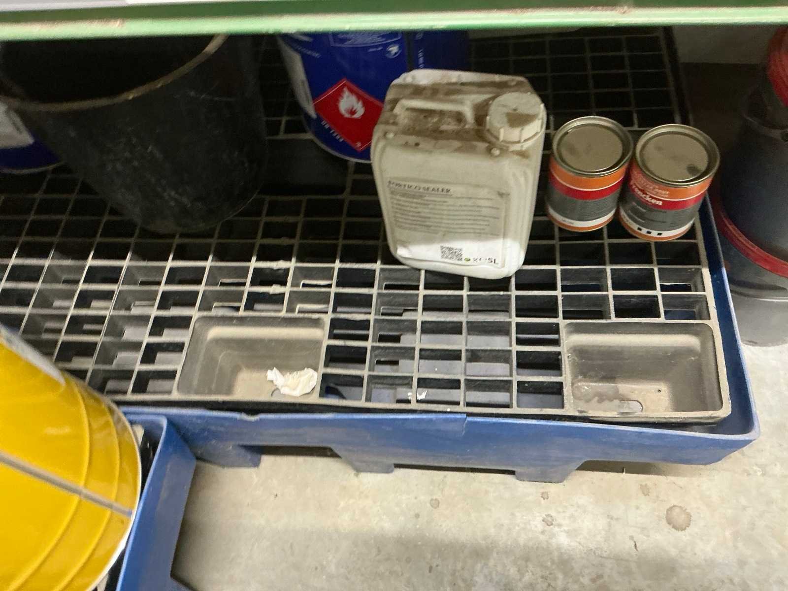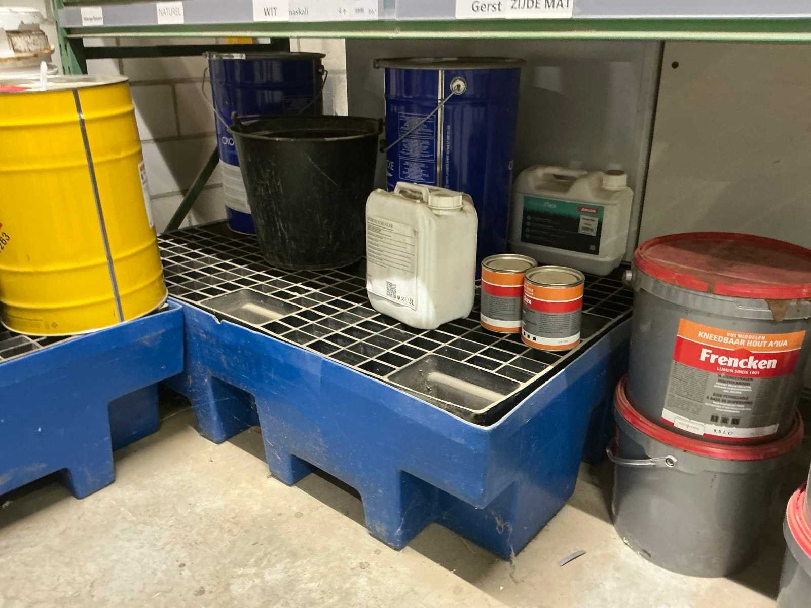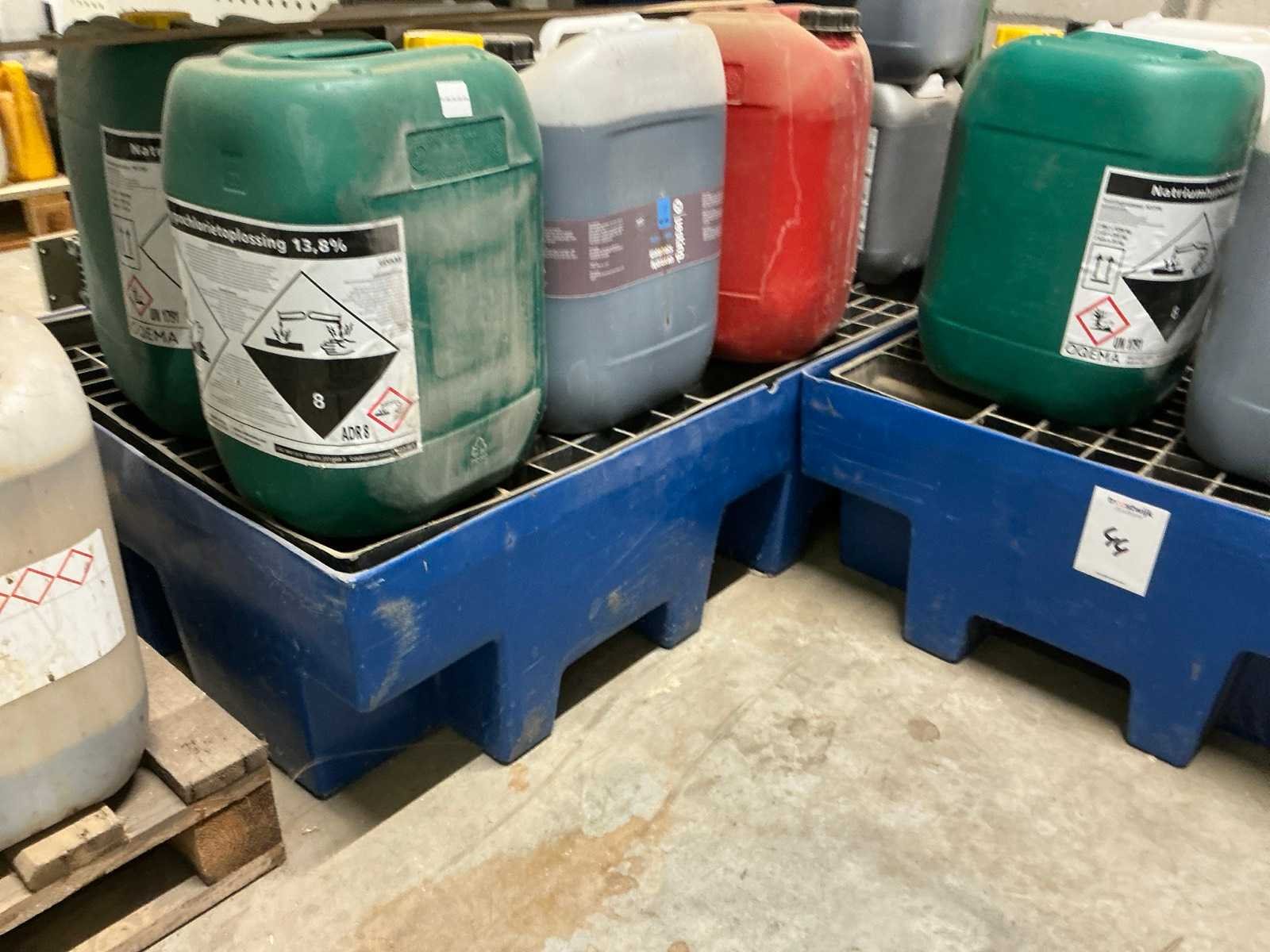 3x kunststof lekbak 122x83x33 cm; 1x stalen lekbak; let op items op de lekbakken behoren niet tot het kavel.