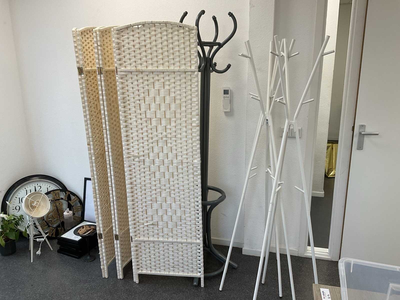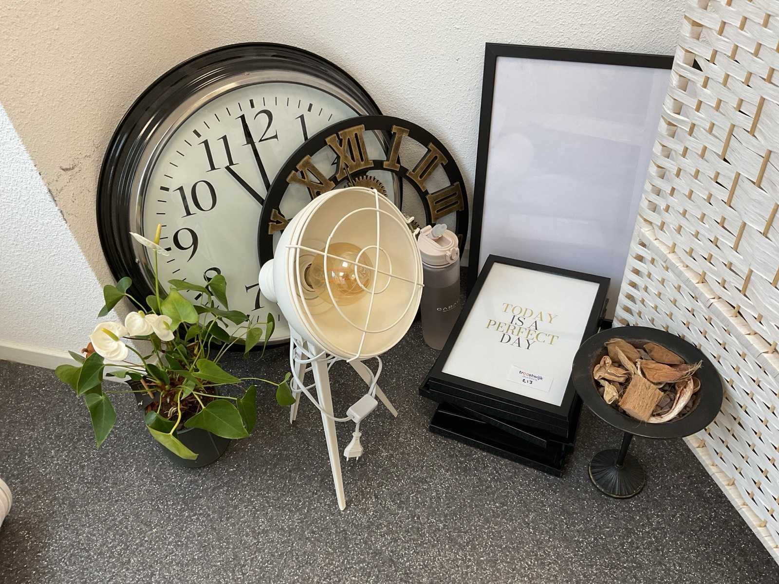 2x klok, kamerplant, diverse fotolijsten, 4x kapstok, bijzetlamp etc