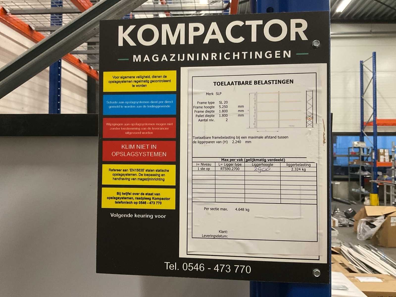 5x staander, 5x verlengstuk staander, 24x liggers, 48x legborden. Inclusief 3 stoelen. Dient vakkundig gedemonteerd te worden. Schade aan pand wordt op de koper verhaald. Merk: Kompactor Type: SLP