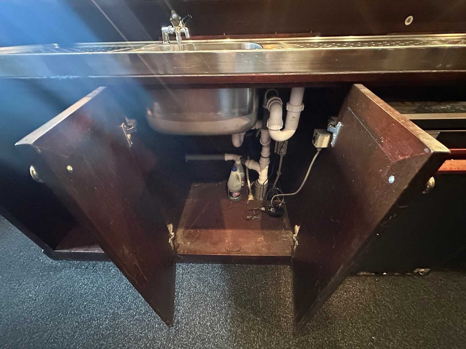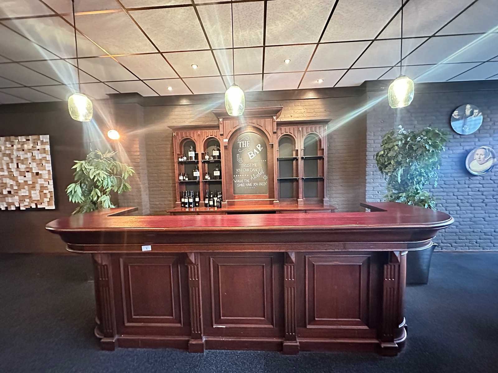 De afmeting van deze bar is 328x90x113 cm (BxDxH). De achterkast heeft een afmeting van 268x51x234 cm (BxDxH). Inclusief lekbladen, spoelbak en de drie glazen hanglampen. Exclusief de flessen in de bar en de twee Gamko koelingen.