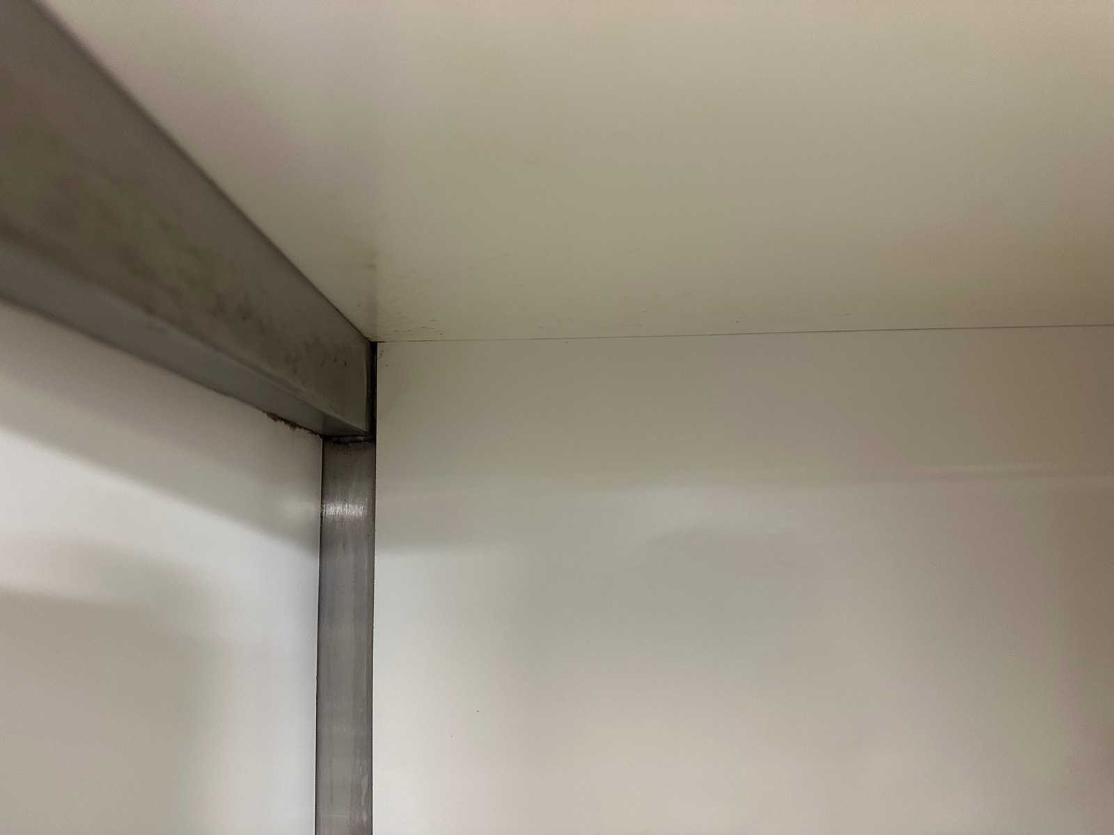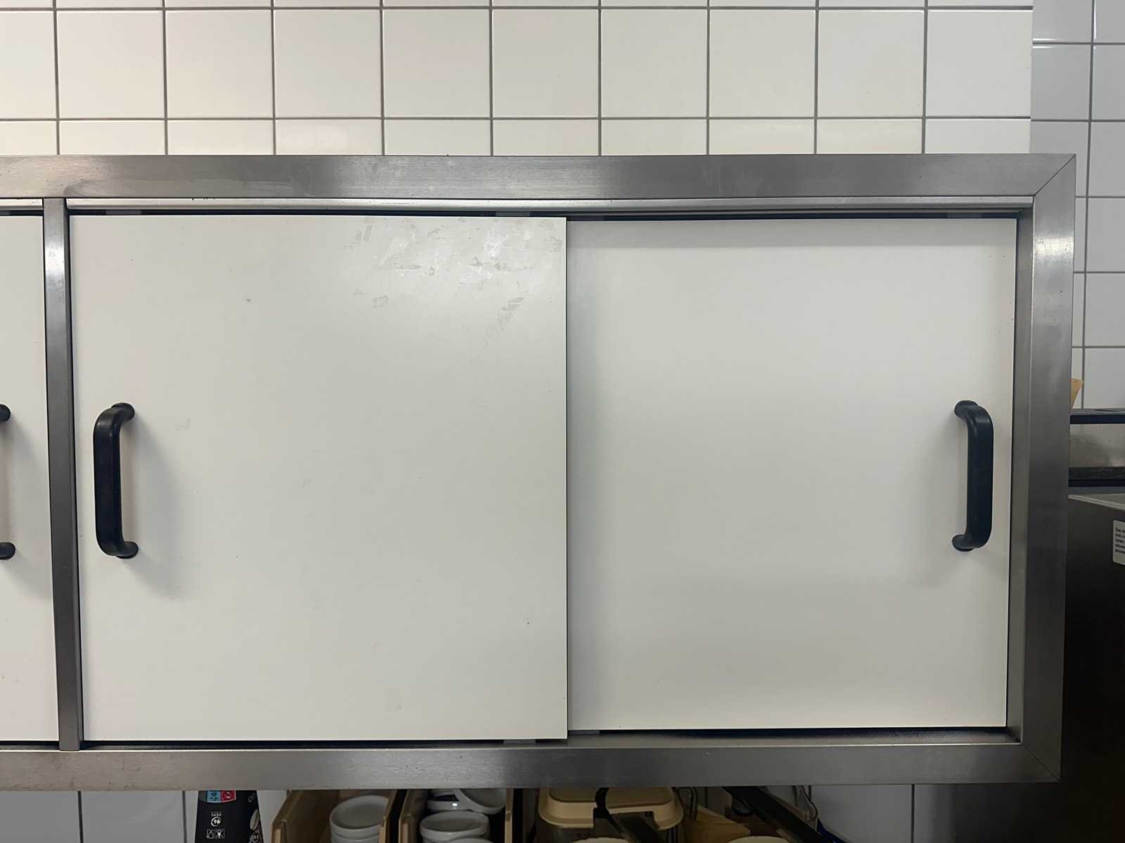 Deze wandkast bestaat uit twee delen van 190 cm breed. Voorzien van 8 trespa schuifdeuren met zwarte kunststof handgreep. Exclusief inhoud. Lengte: 190cm Breedte: 40cm Hoogte: 60cm Materiaal: RVS en trespa