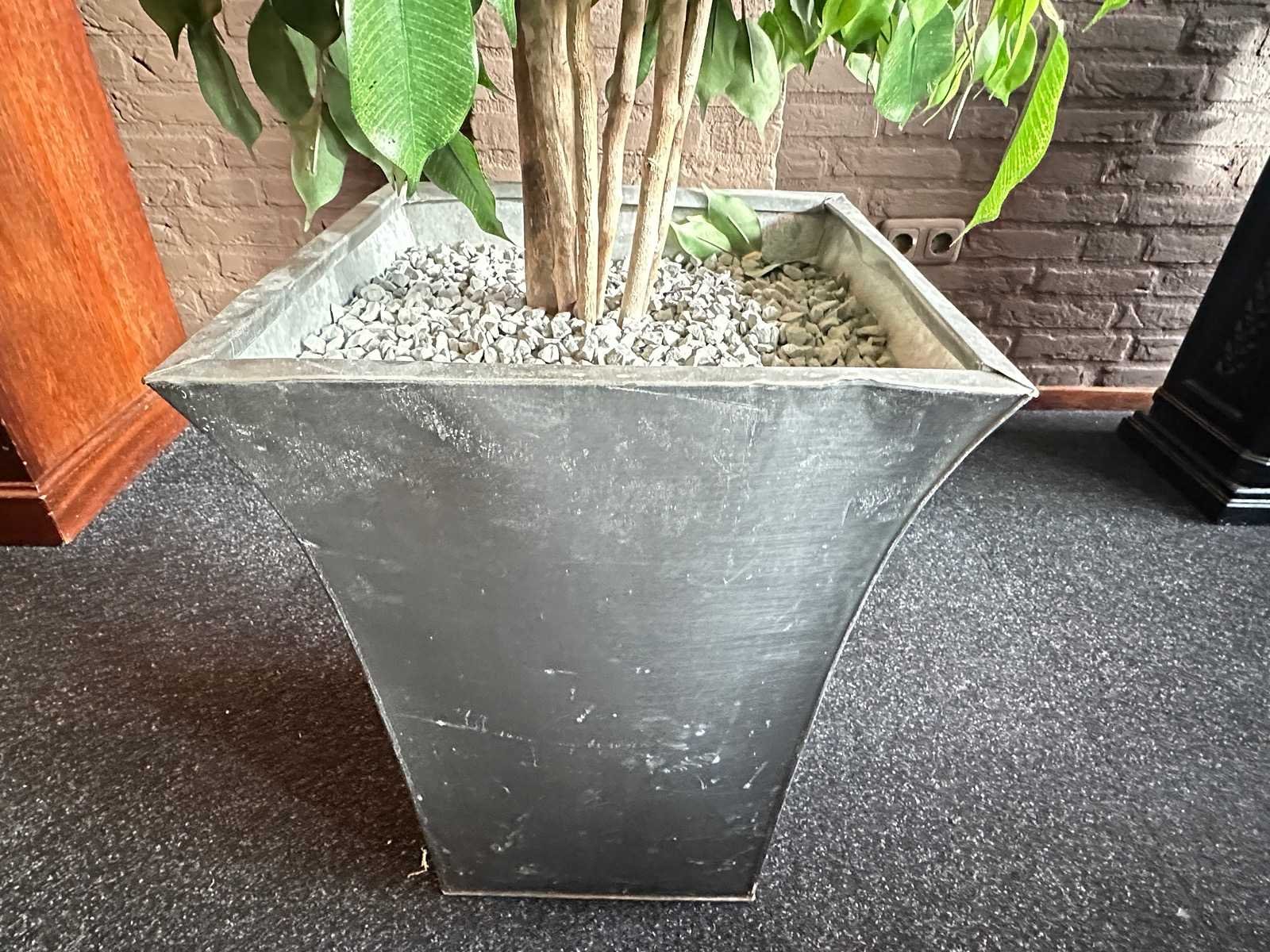 Deze kunst Ficus zit in een zware metalen pot met grind. Totale afmeting Hoogte: 204cm