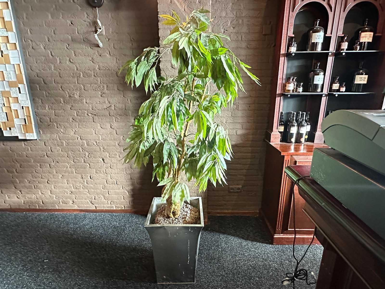 Deze kunst Ficus zit in een zware metalen pot met grind. Totale afmeting Hoogte: 190cm
