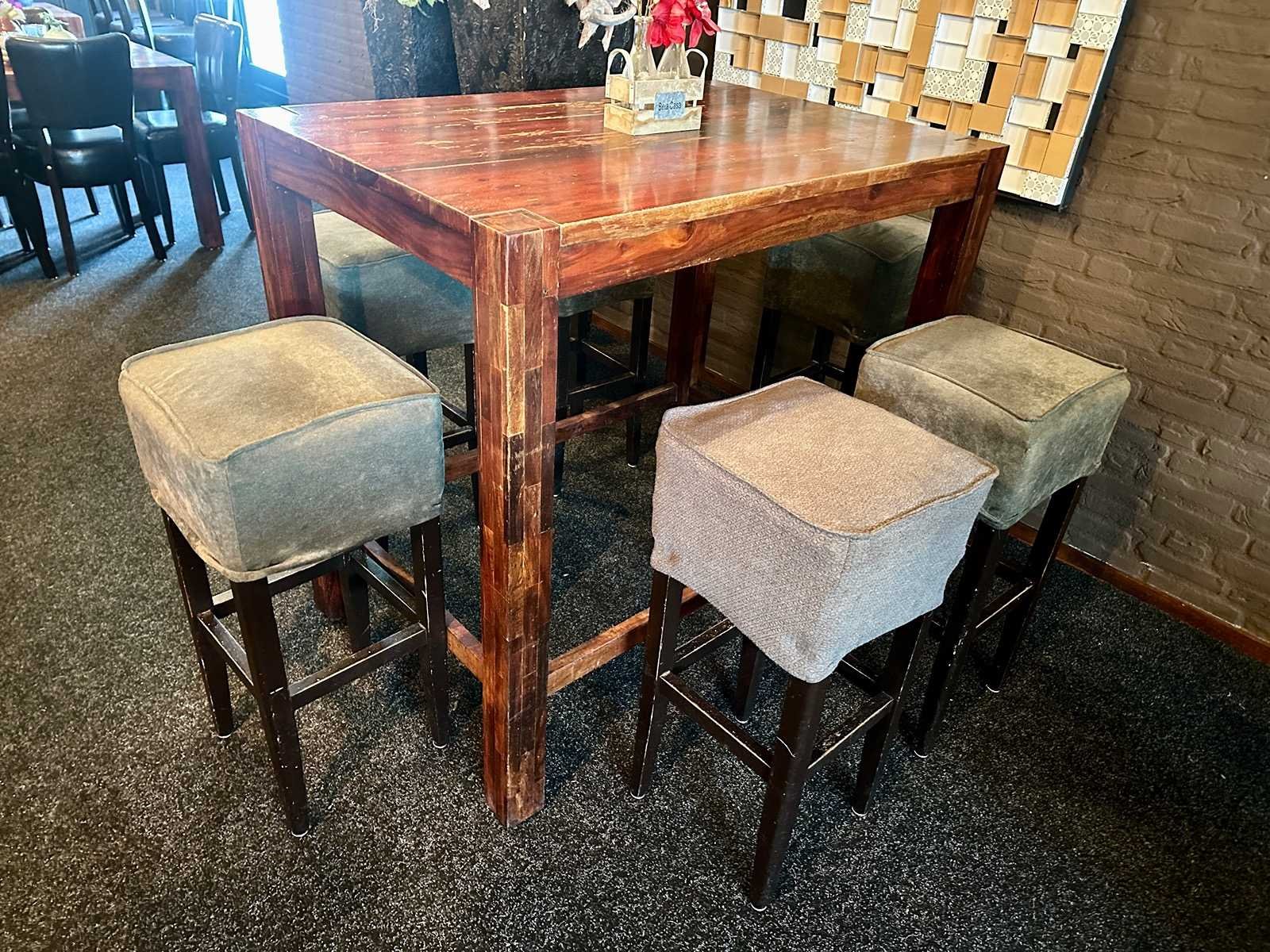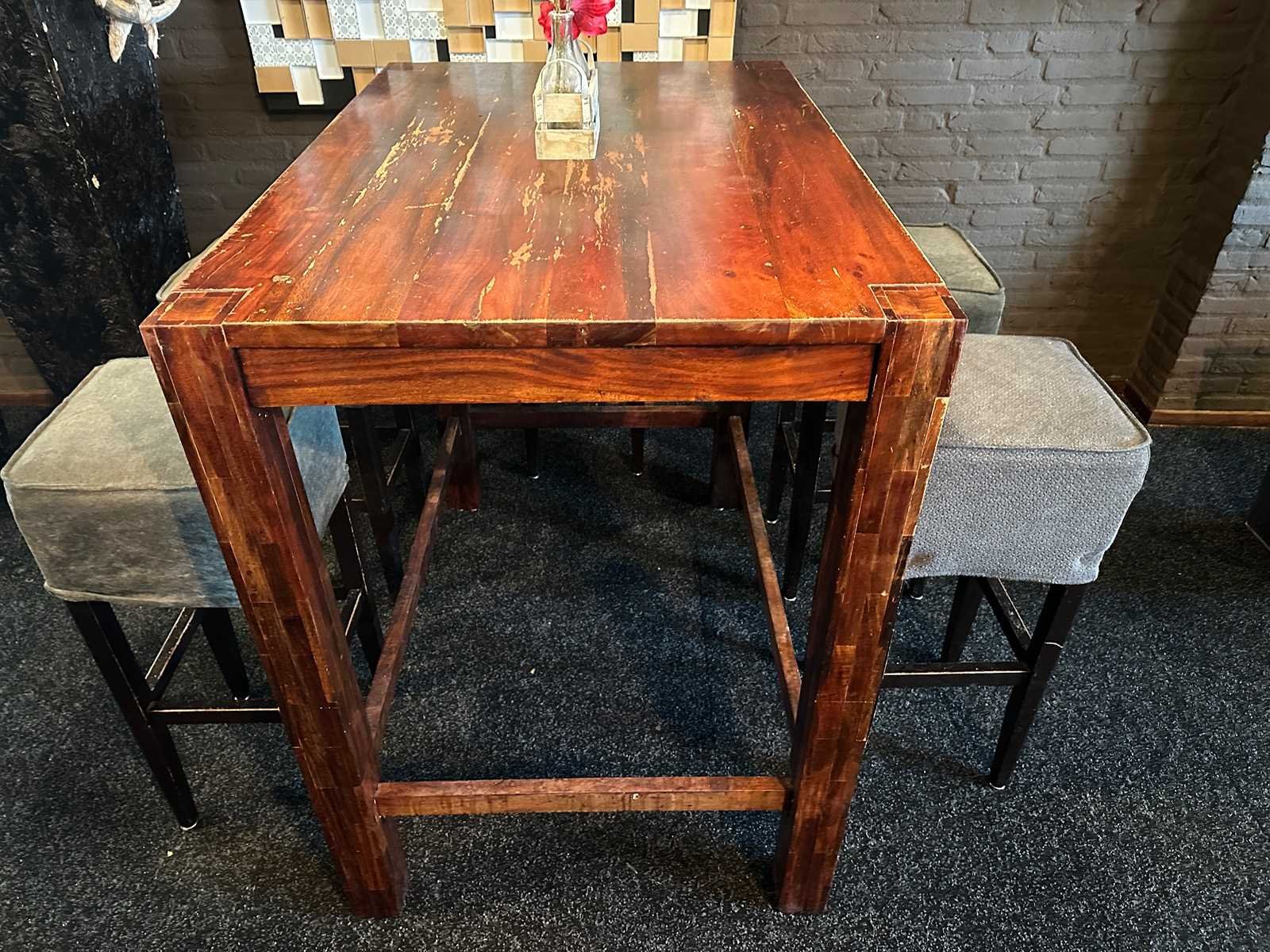 Afmeting van de kruk is 37x37x80 cm (LxDxH) De stoffering van de krukken is beschadigd. Totale afmeting L: 1200mm Totale afmeting Breedte: 810mm Totale afmeting Hoogte: 1110mm Materiaal: hout
