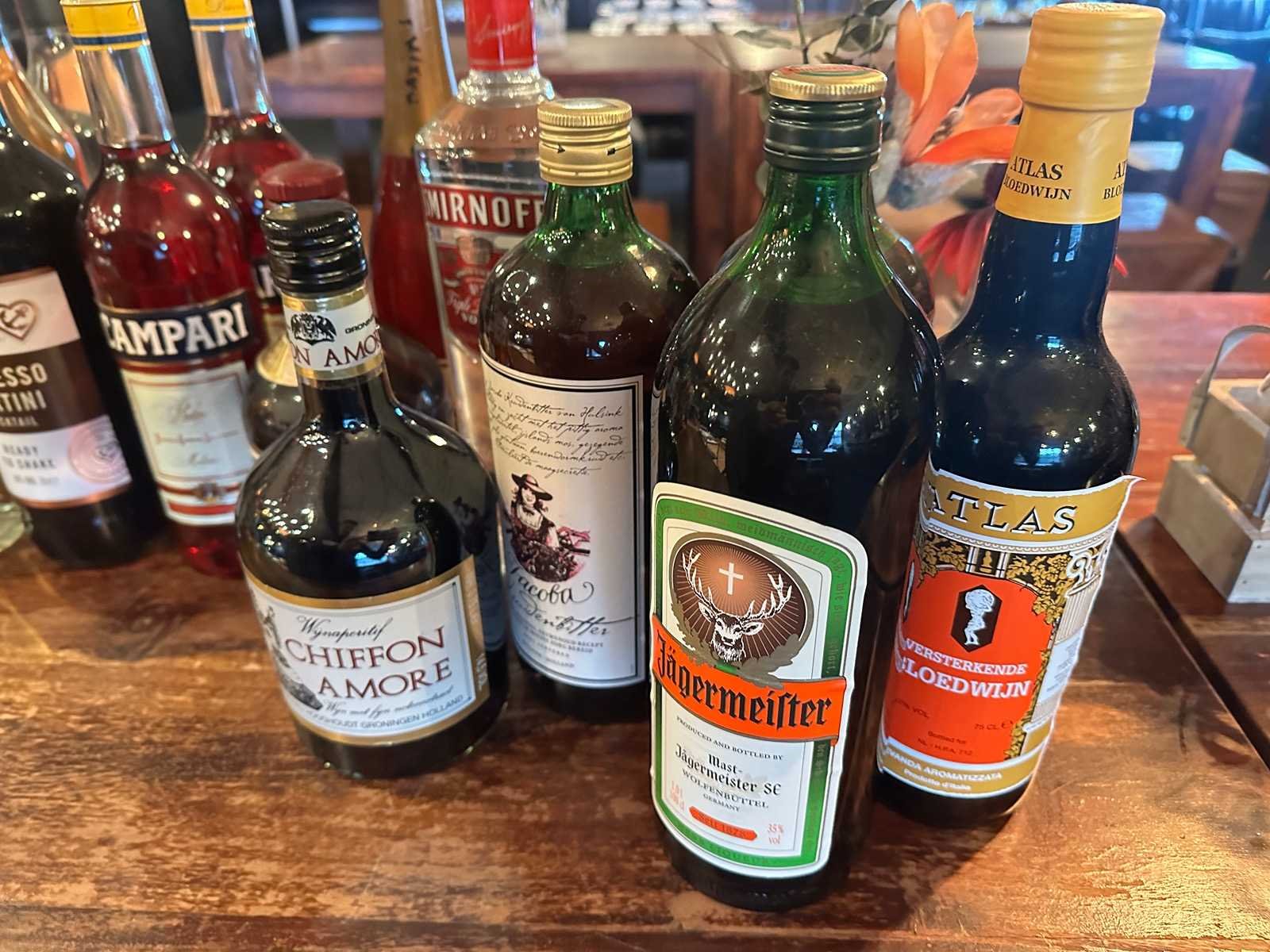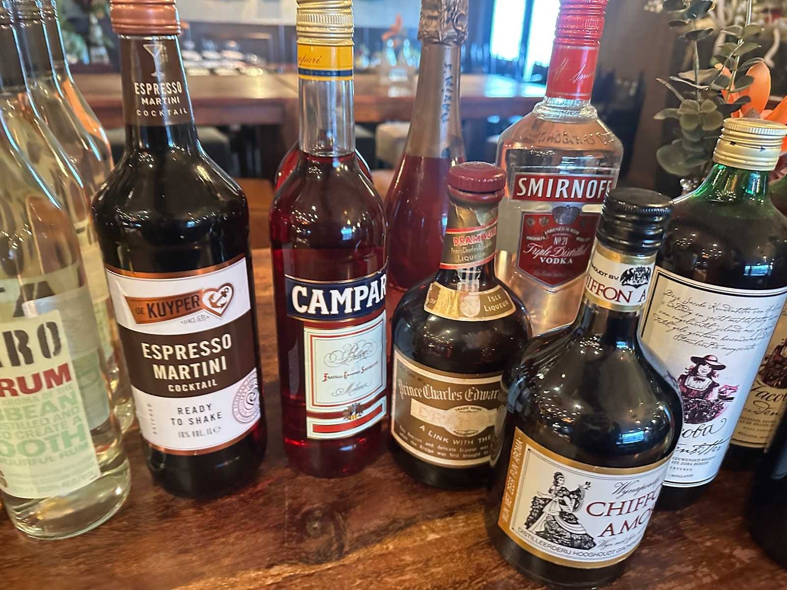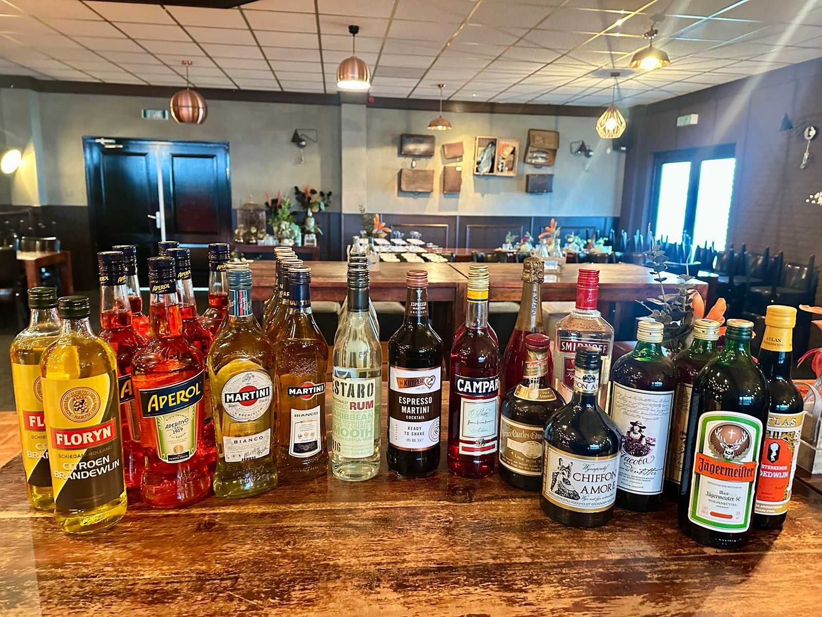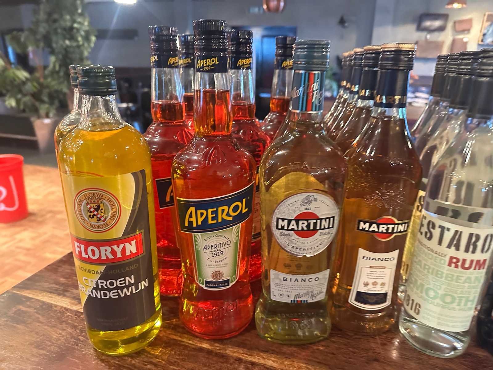 Deze partij van 28 onaangebroken flessen bestaat uit diverse likeuren, Aperol, Martini en Campari.