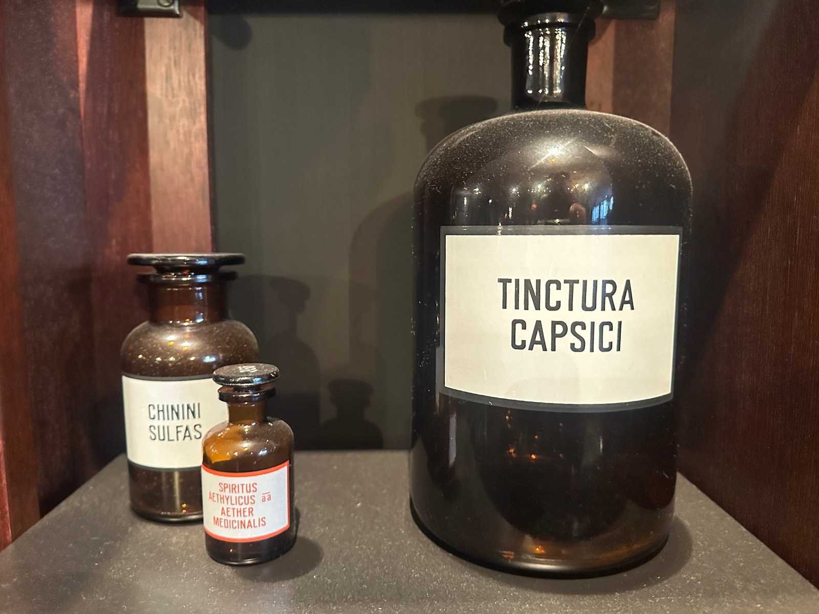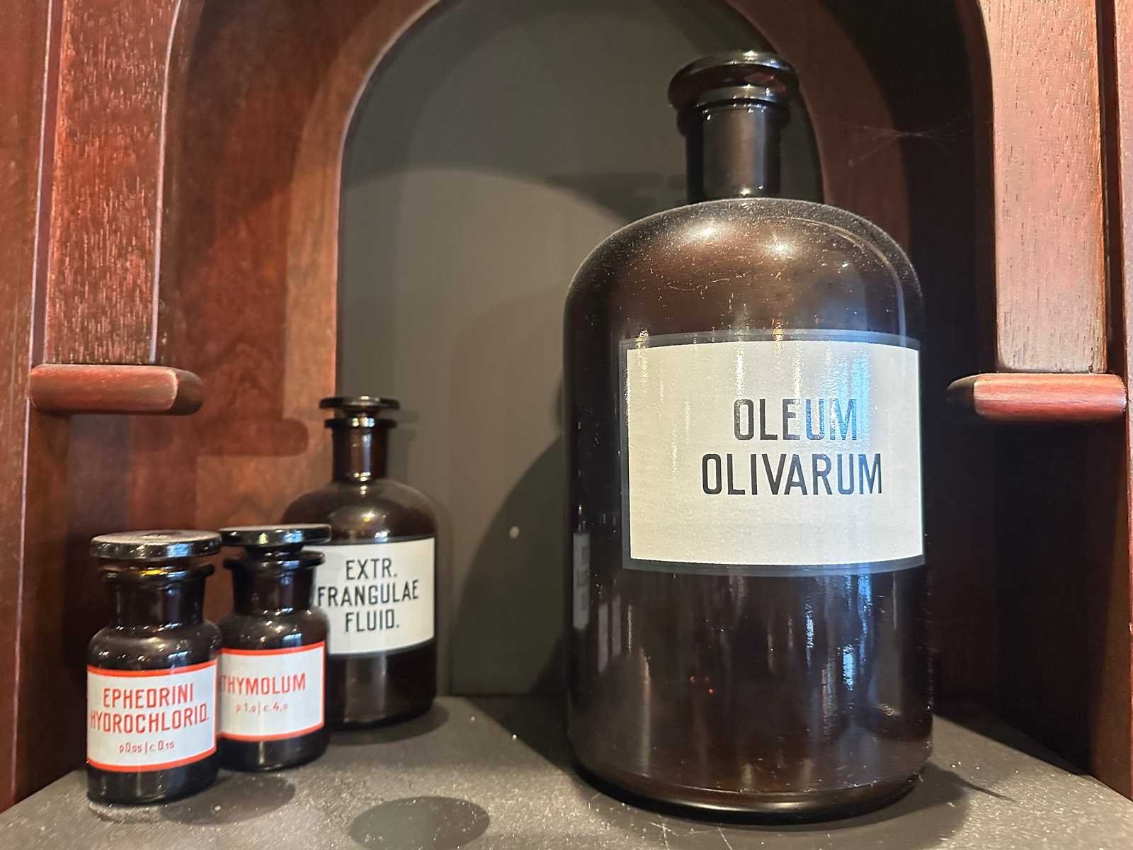 Deze set van 14 apothekerspotten van bruin glas is leeg.
