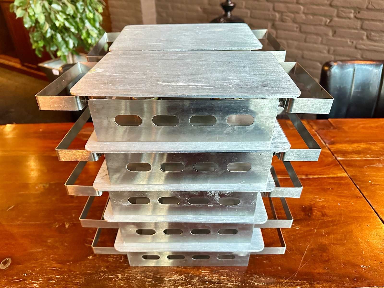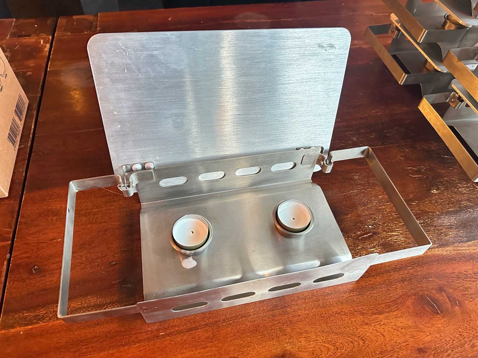 Deze metalen rechauds worden verwarmd door twee waxinelichtjes. Totale afmeting L: 37cm Totale afmeting Breedte: 18cm Totale afmeting Hoogte: 7cm Rvs: true