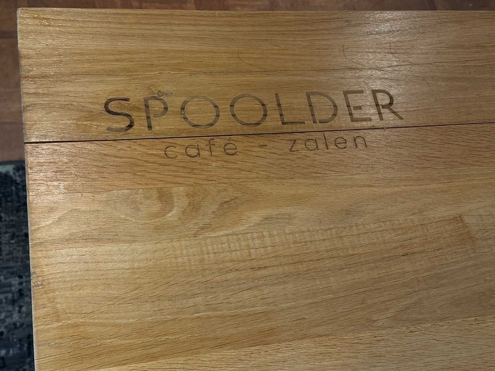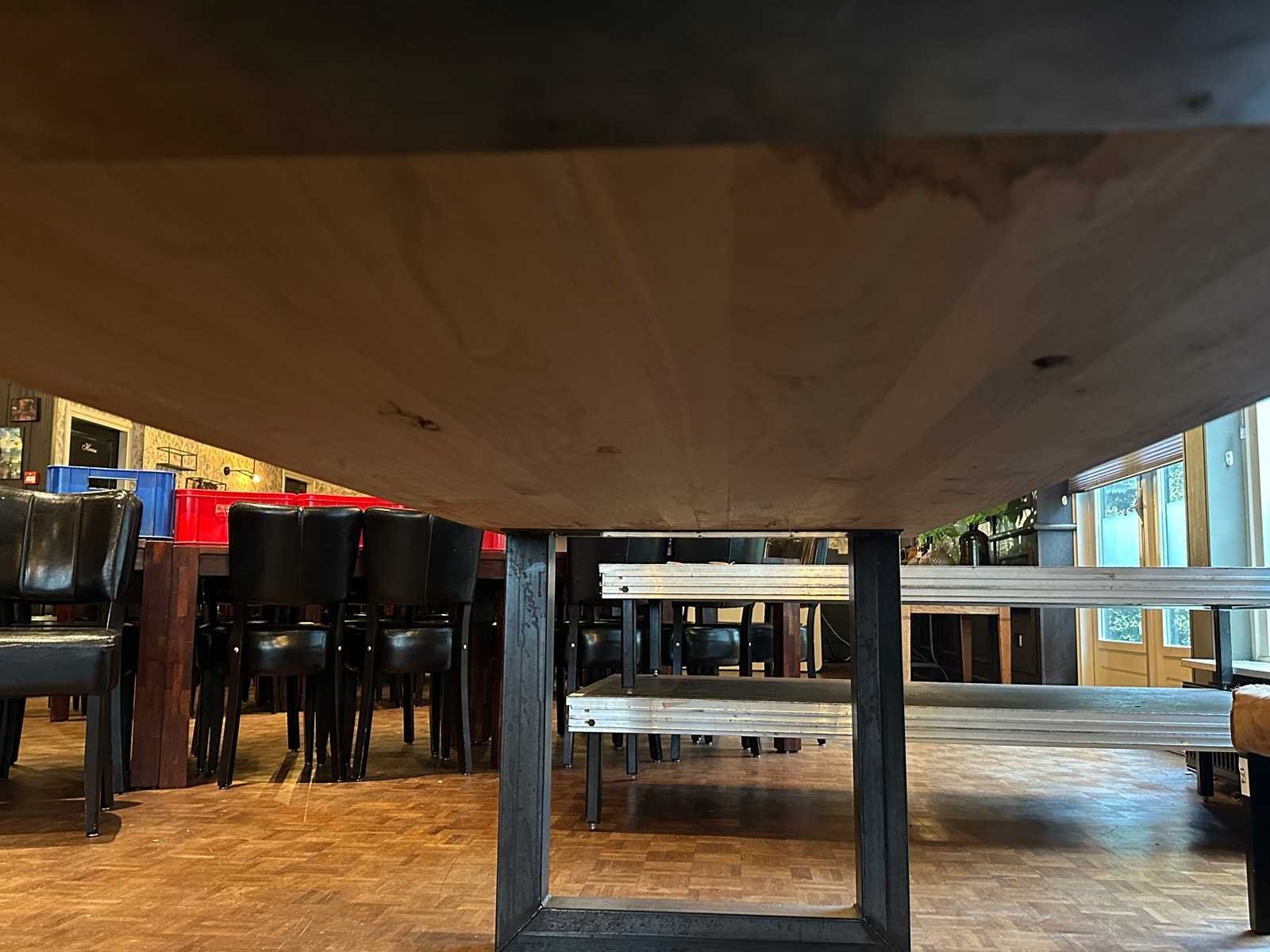 Houten blad op stalen U-frame. Lengte: 209cm Breedte: 80cm Hoogte: 78cm