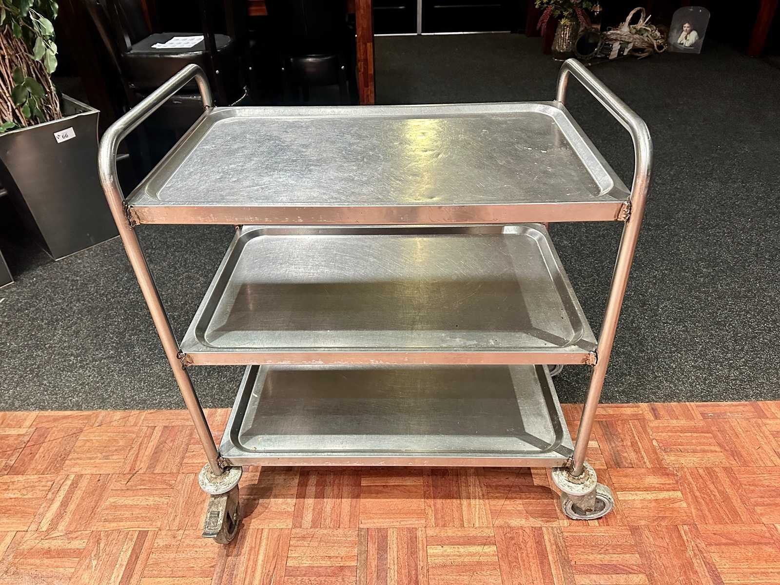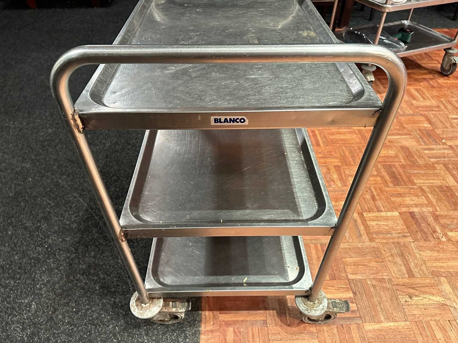 Voorzien van drie plateaus en twee geremde wielen. Merk: Blanco Totale afmeting L: 830mm Totale afmeting Breedte: 500mm Totale afmeting Hoogte: 940mm Rvs: true