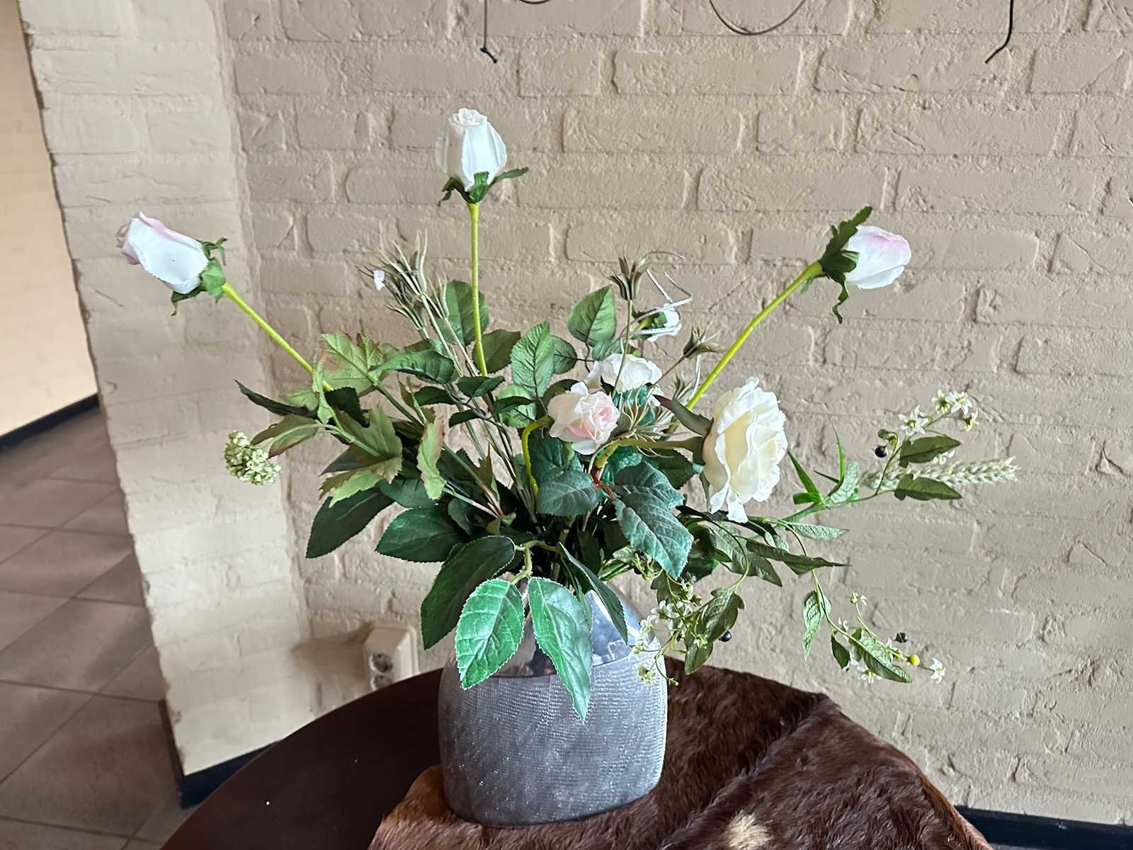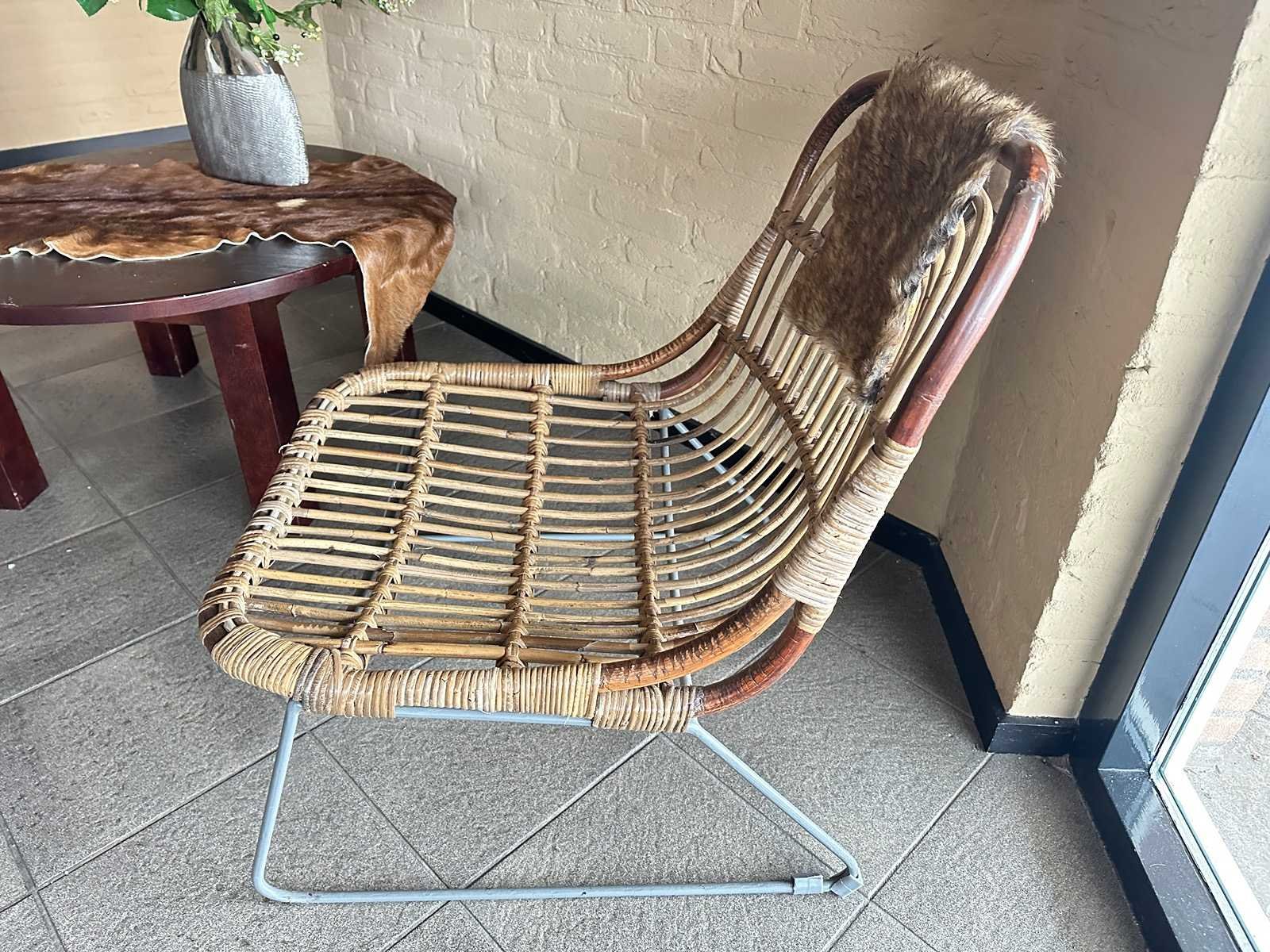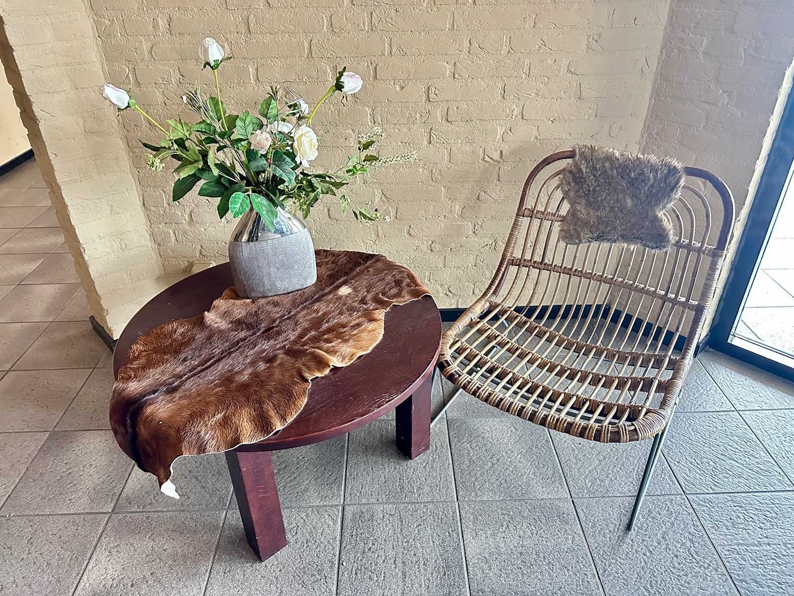 Diameter van de salontafel is 80 cm en hij is 42 cm hoog. Inclusief dierenhuid en vaas met kunstrozen. Zithoogte: 29cm