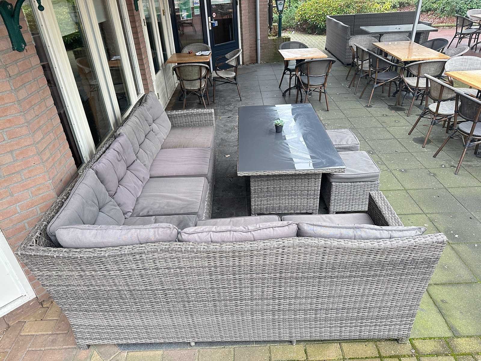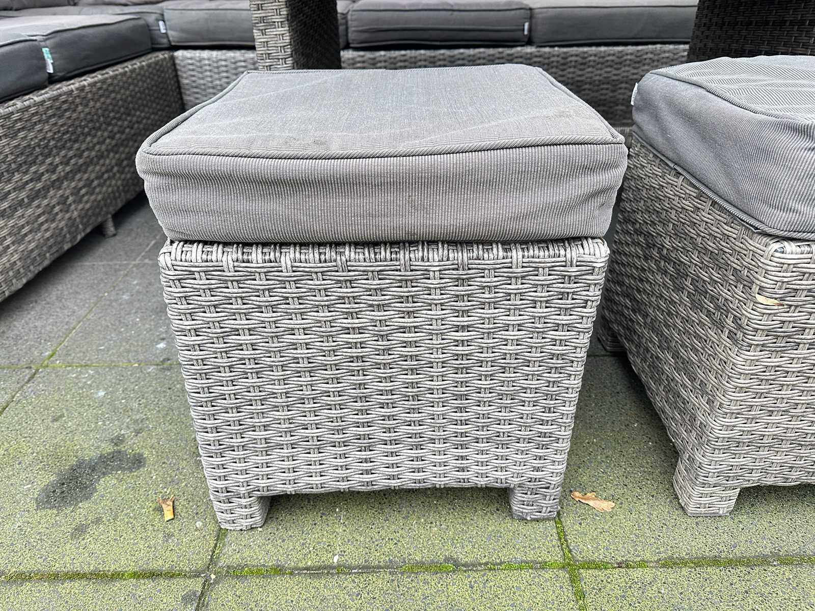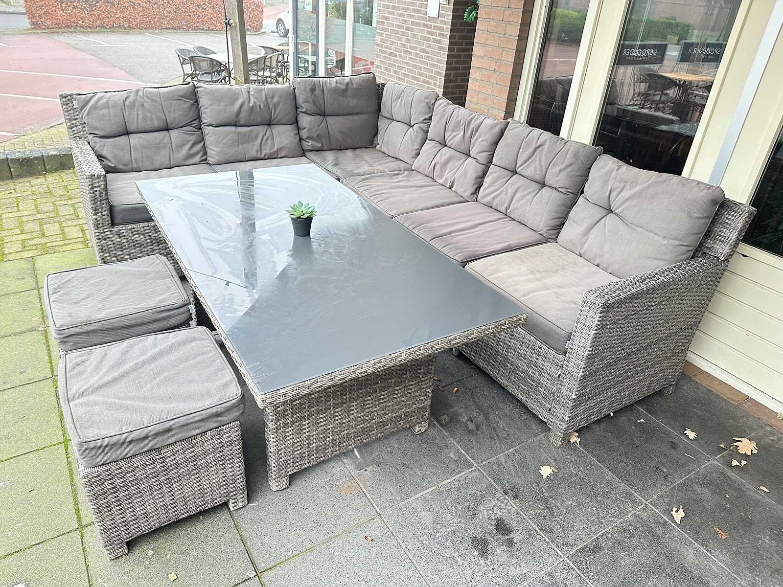 Deze set bestaat een hoekbank, tafel en twee hockers. De afmeting van de bank is 250x200x84 cm (LxBxH). Afmeting van de tafel met glasplaat is 150x80x66 cm (LxBxH). Afmeting van de hocker is 40x40x37 cm (LxBxH). Inclusief 6 zitkussens, 7 rugkussens en 2 kussens voor de hockers. Merk: Garden Impressions Kussens: true Materiaal: wicker