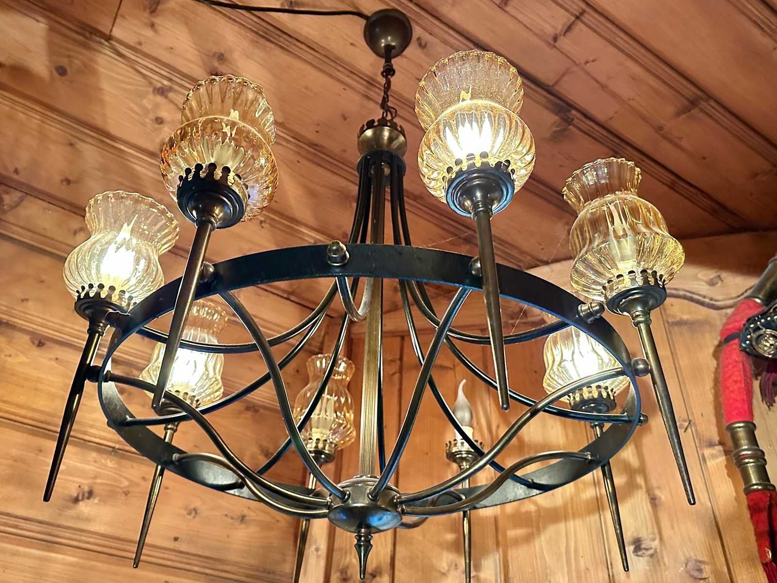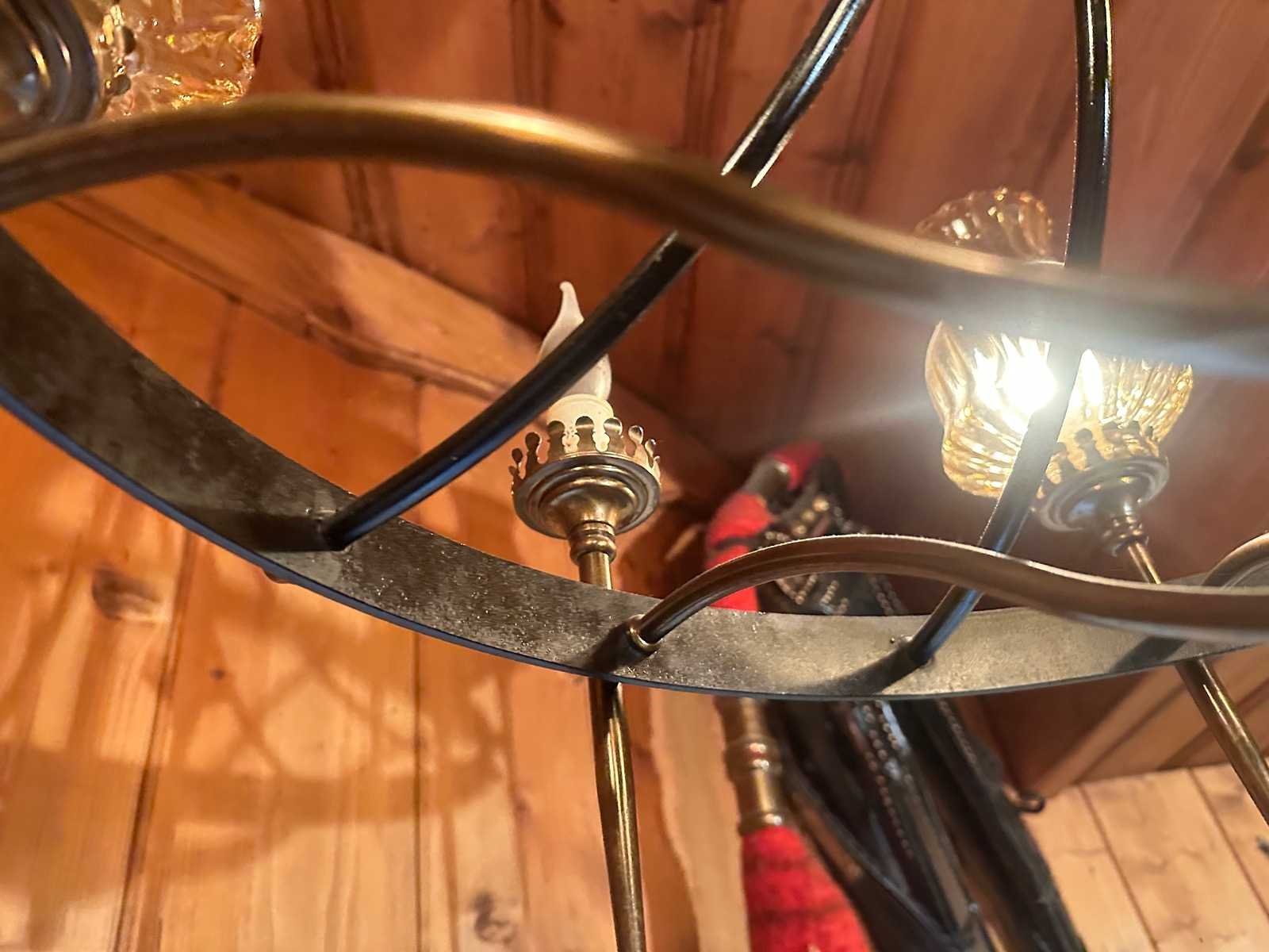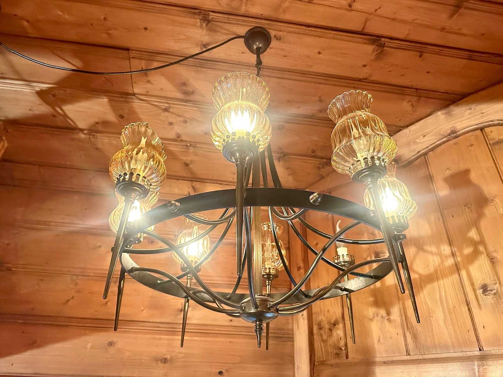 Deze stalen kroonluchter heeft 8 lampen waarvan 1 glazen kap ontbreekt. Breedte: 62cm Hoogte: 100cm