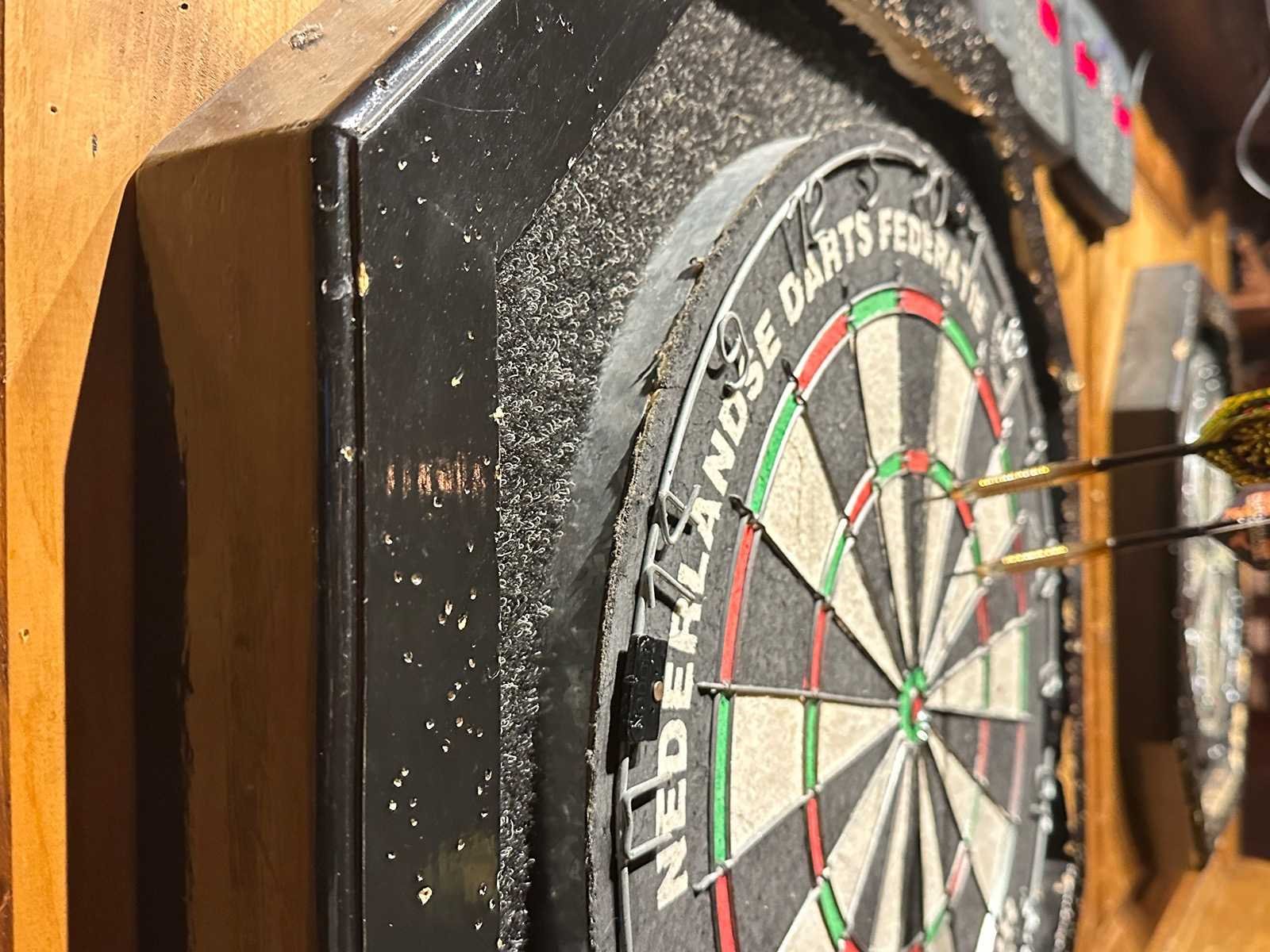 Deze set bestaat uit twee NODOR dartborden in houten kast, 2 electronische scoreborden, richtspots en twee maal een rvs oche met twee pinnen om makkelijk te verwijderen.