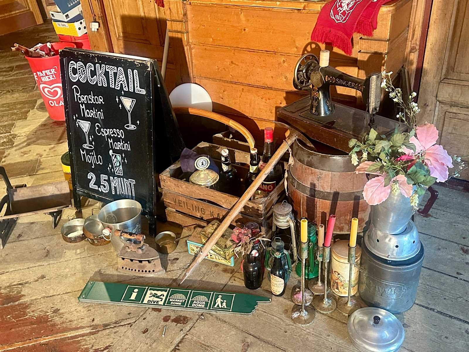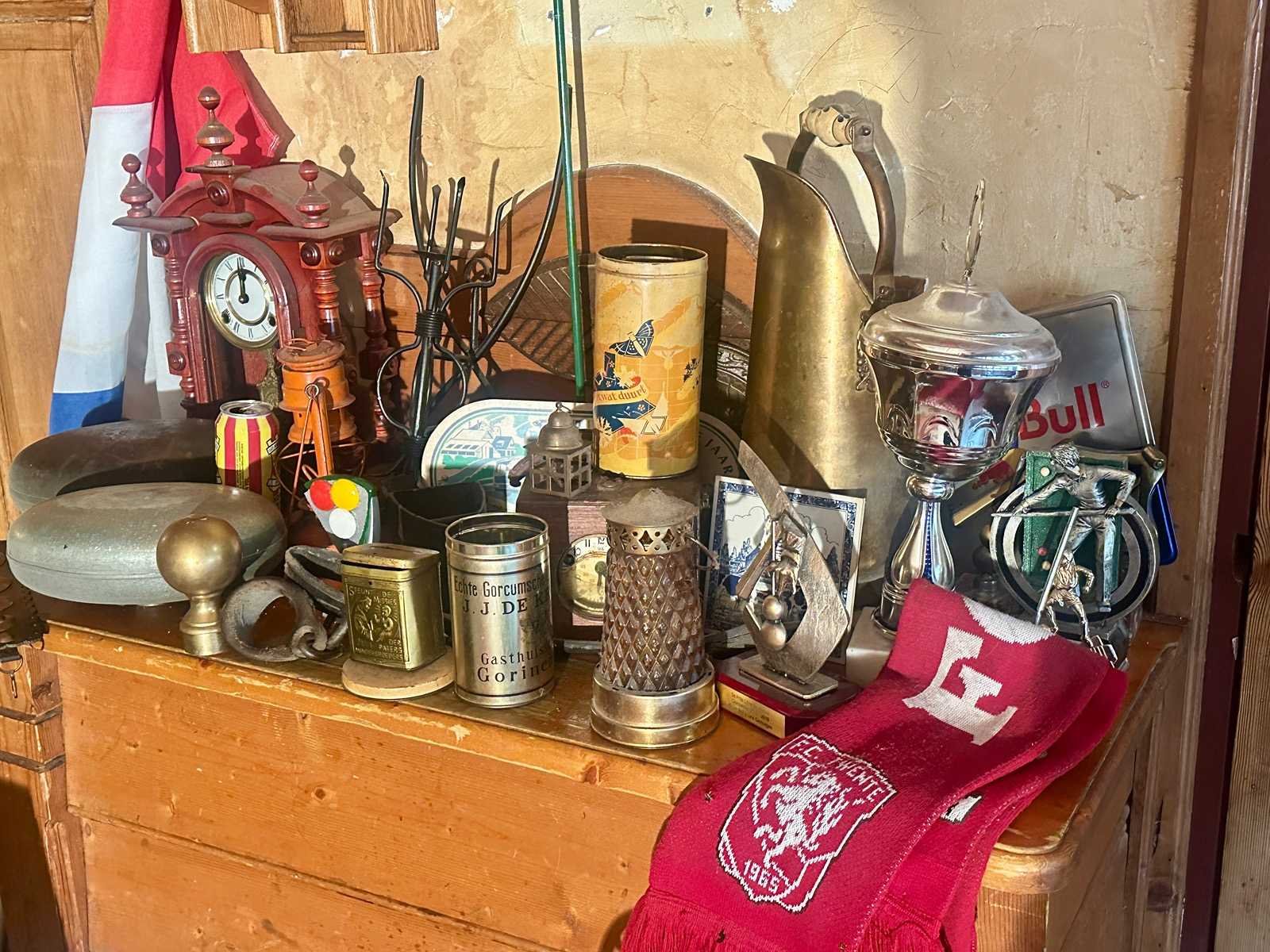 Deze partij bestaat uit verschillende items die in het café ter decoratie zijn gebruikt. Naast dit materiaal horen ook de borden die nog in het café aan de wanden en aan het plafond hangen.