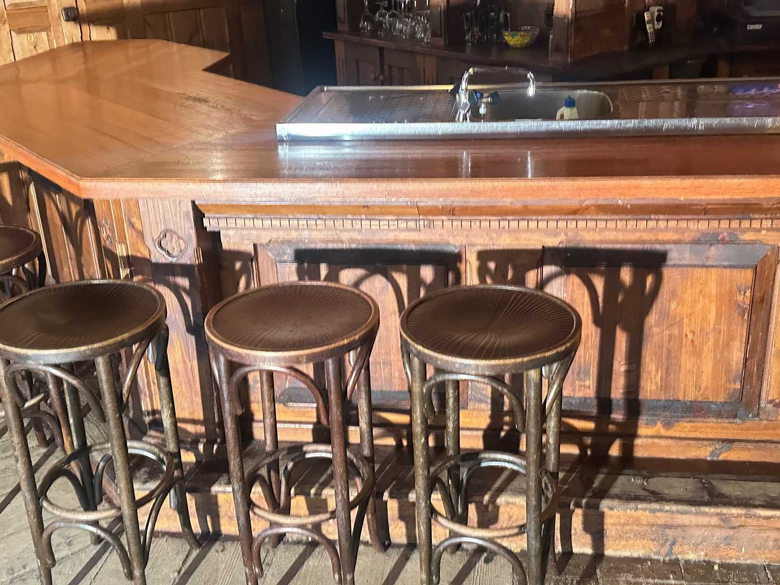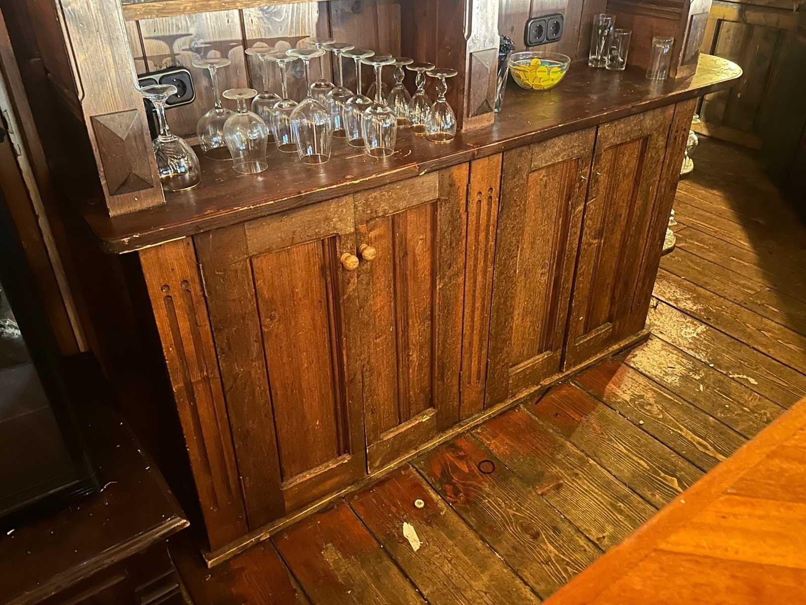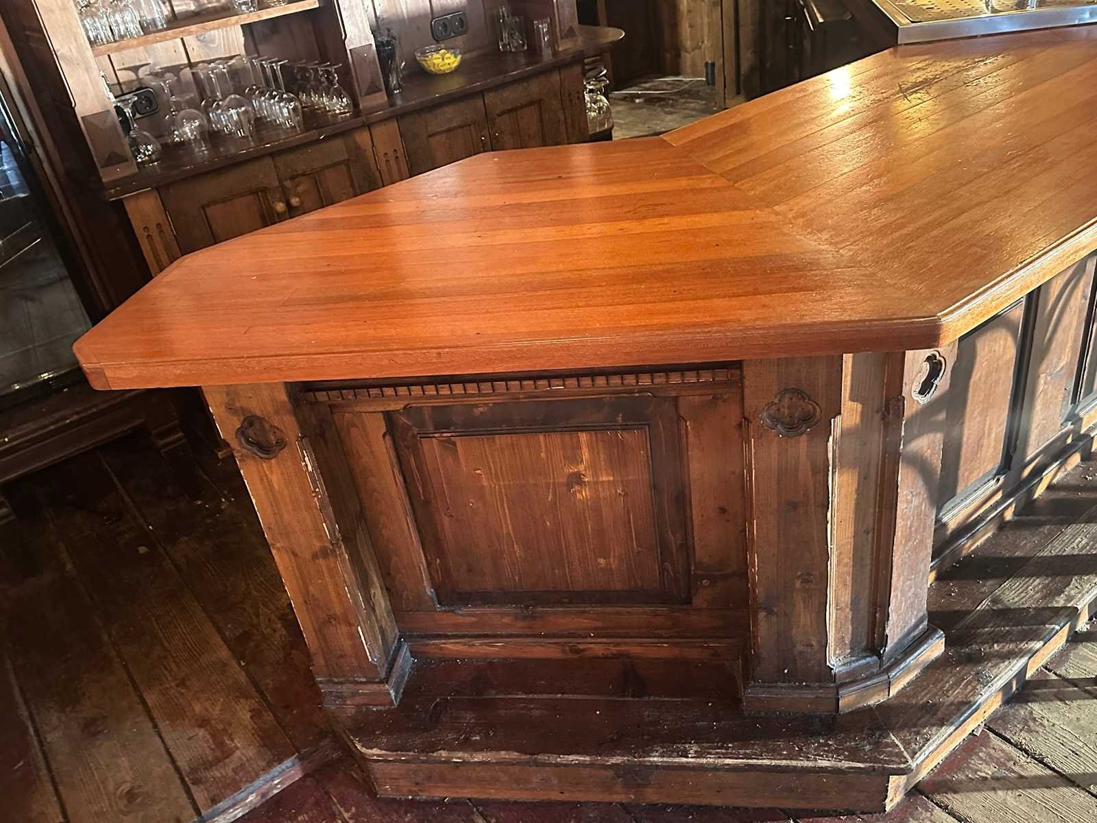 Deze rustieke volledige cafébar bestaat uit een bar, bovenbouw en achterkast. De afmeting van de bar is 490x460x105 cm. De kast heeft een afmeting van 170x60x 285 cm. Exclusief barkoeling en kassasysteem. Inclusief antieke scheepsbel. Totale afmeting L: 4900mm Totale afmeting Breedte: 4600mm Totale afmeting Hoogte: 2850mm