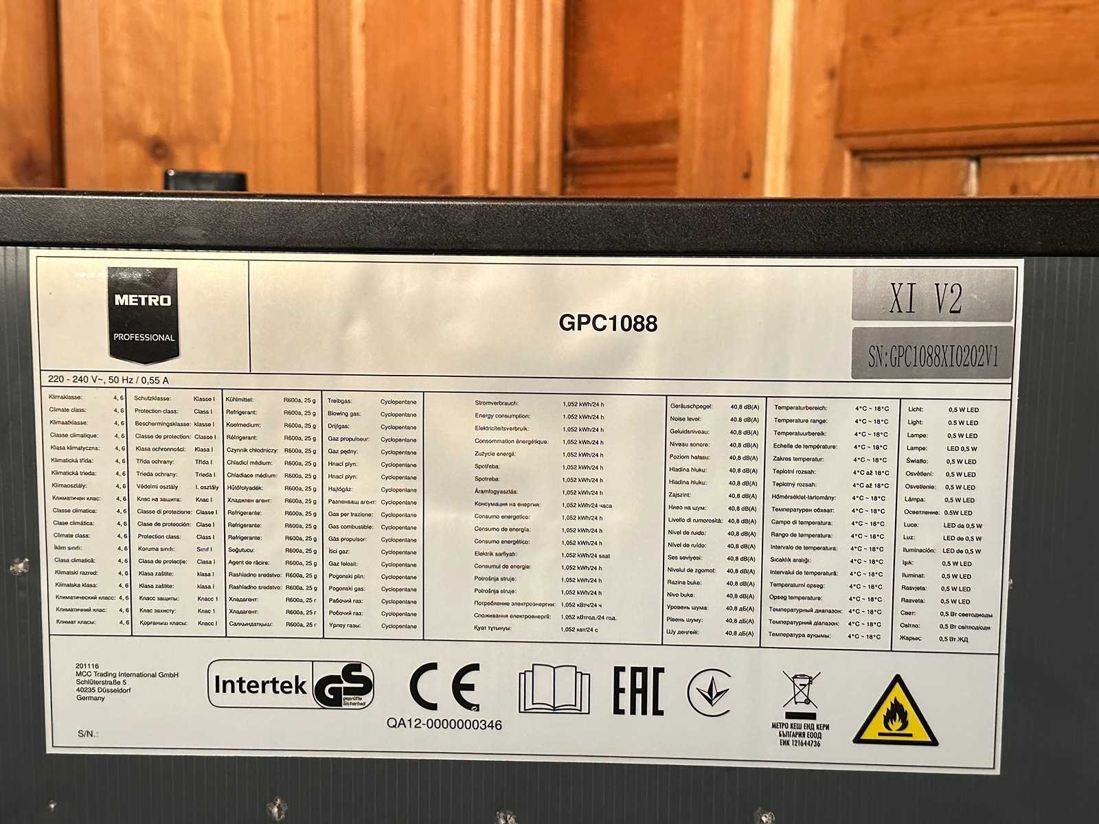 Merk: Metro Type: GPC1088 Serienummer: GPC1088XI0202V1 Temperatuurbereik min.: 4°c Temperatuurbereik max.: 18°c Aansluiting: 230V