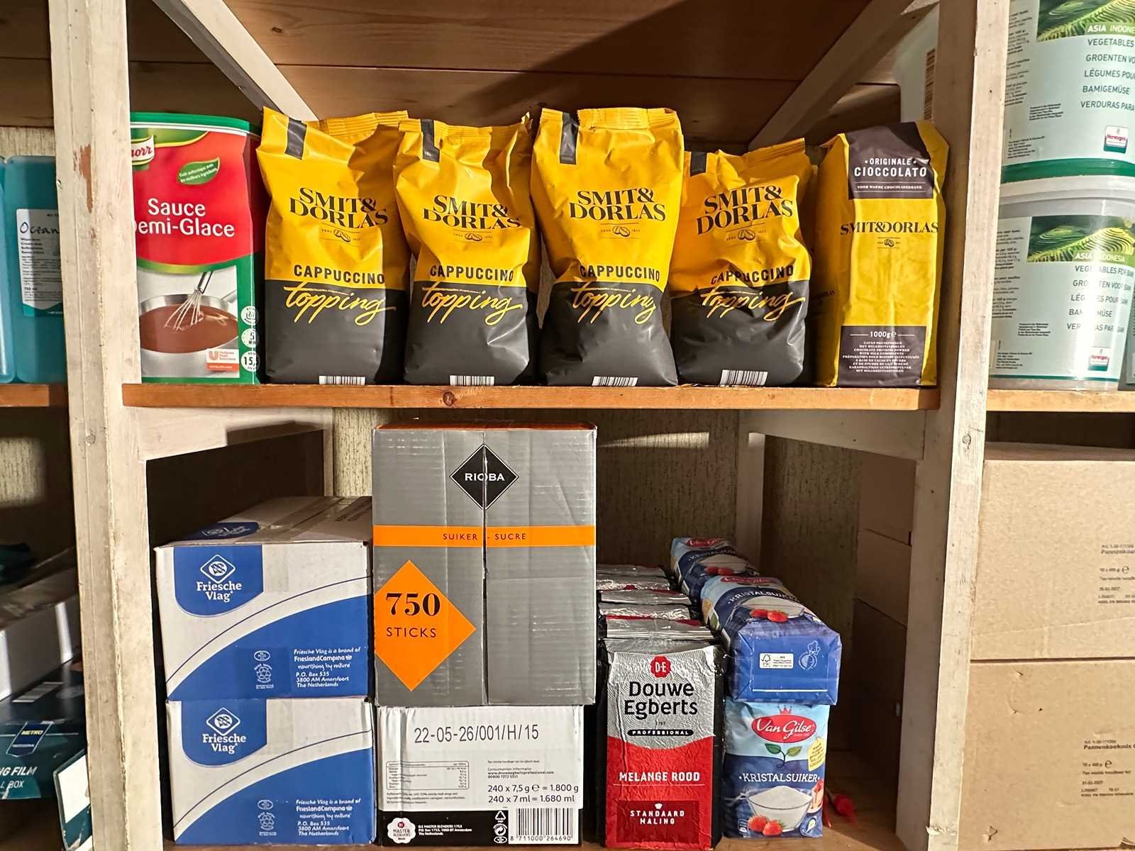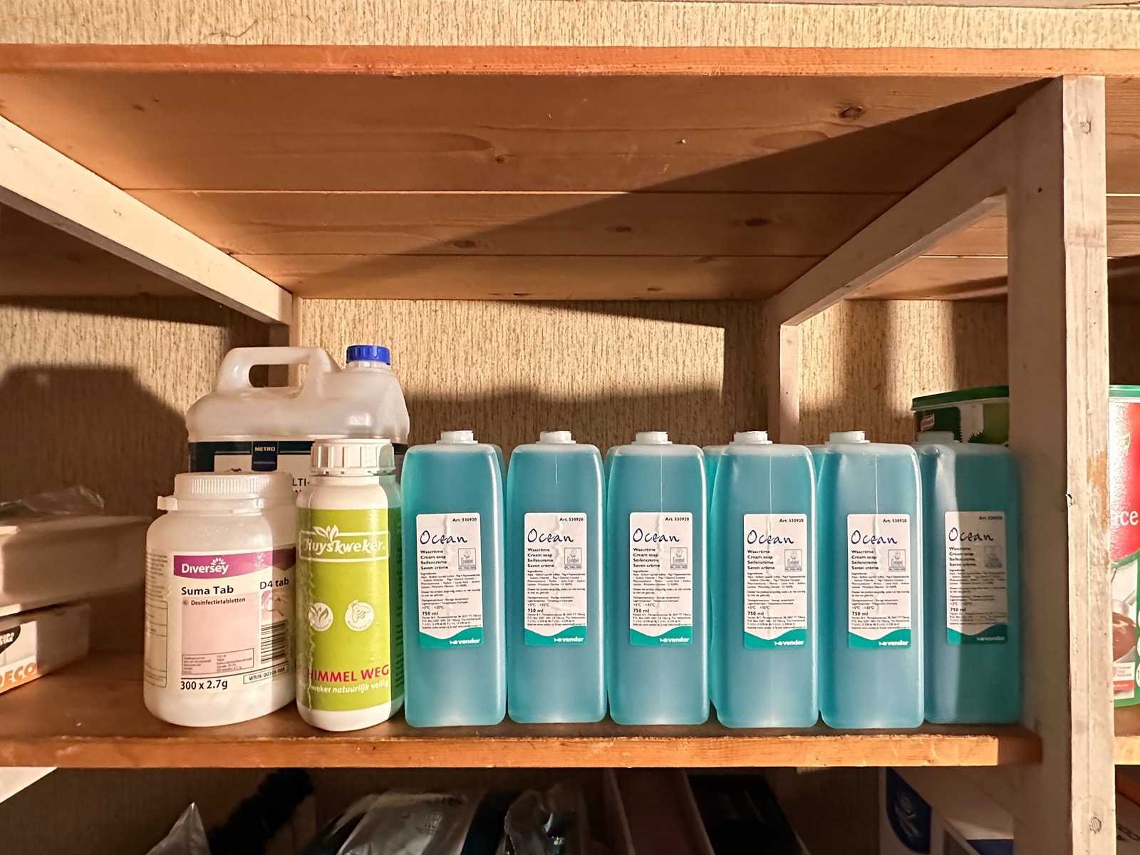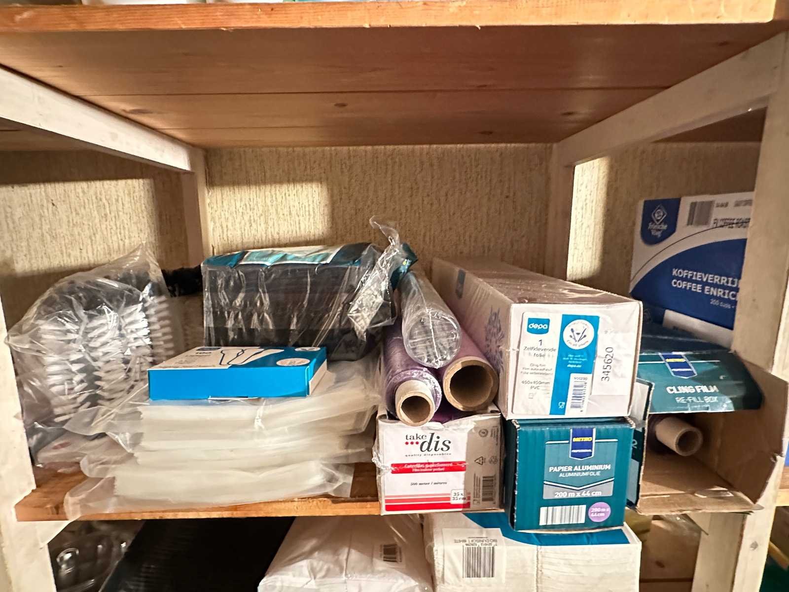 Deze inhoud bestaat uit schoonmaakproducten, disposables, koffie en overige keukenbenodigdheden.