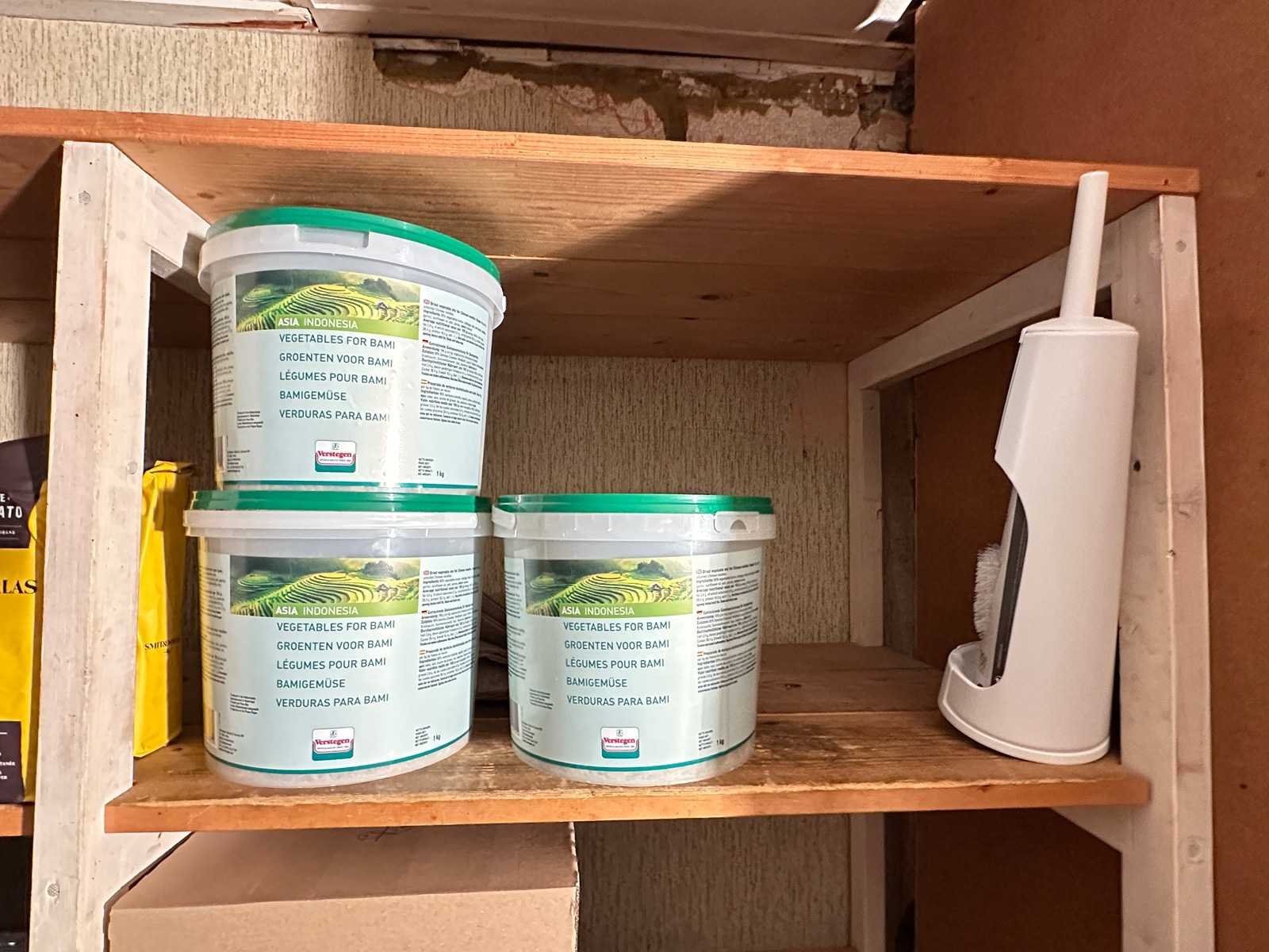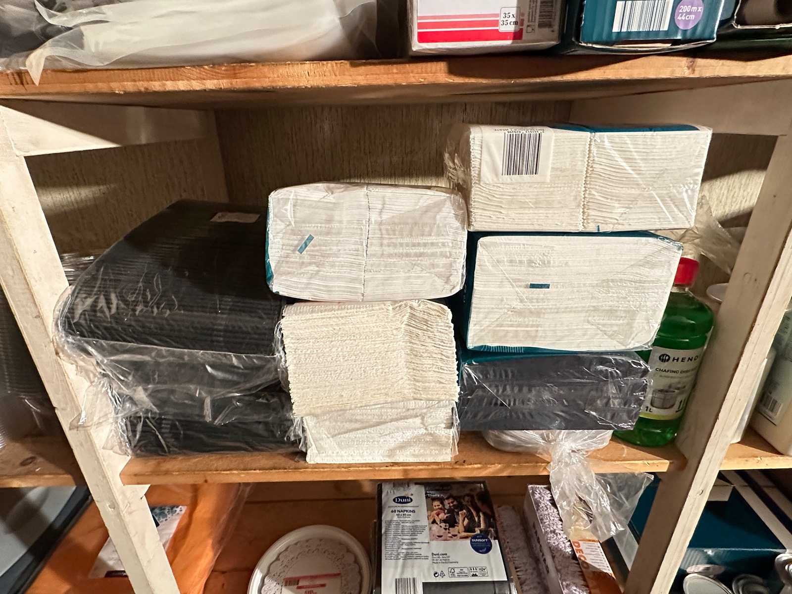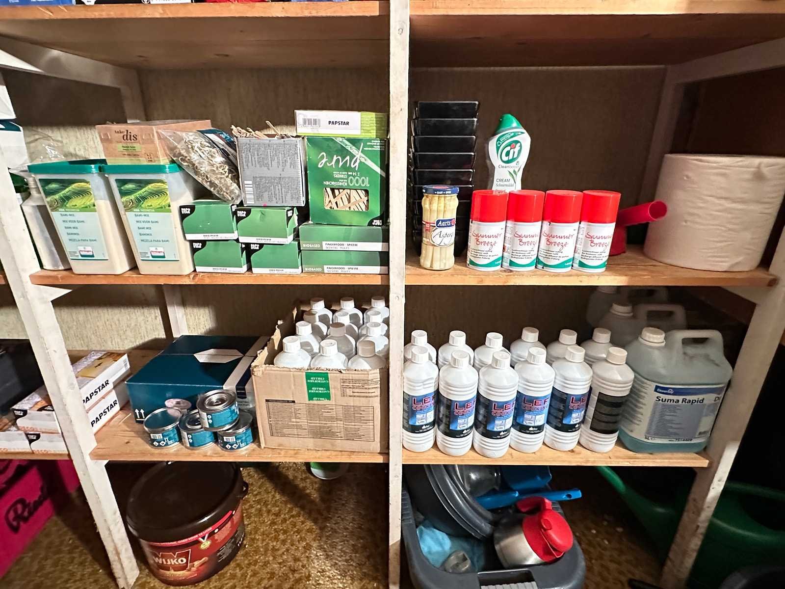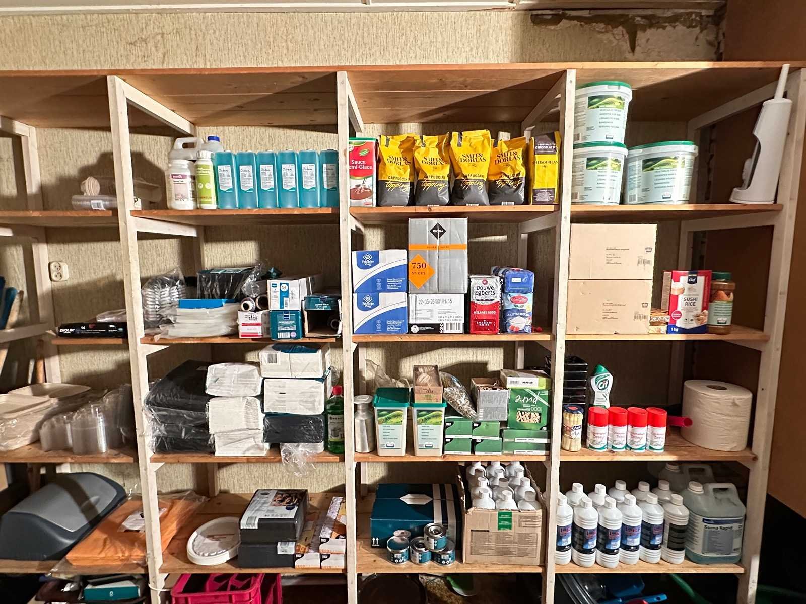Deze inhoud bestaat uit schoonmaakproducten, disposables, koffie en overige keukenbenodigdheden.