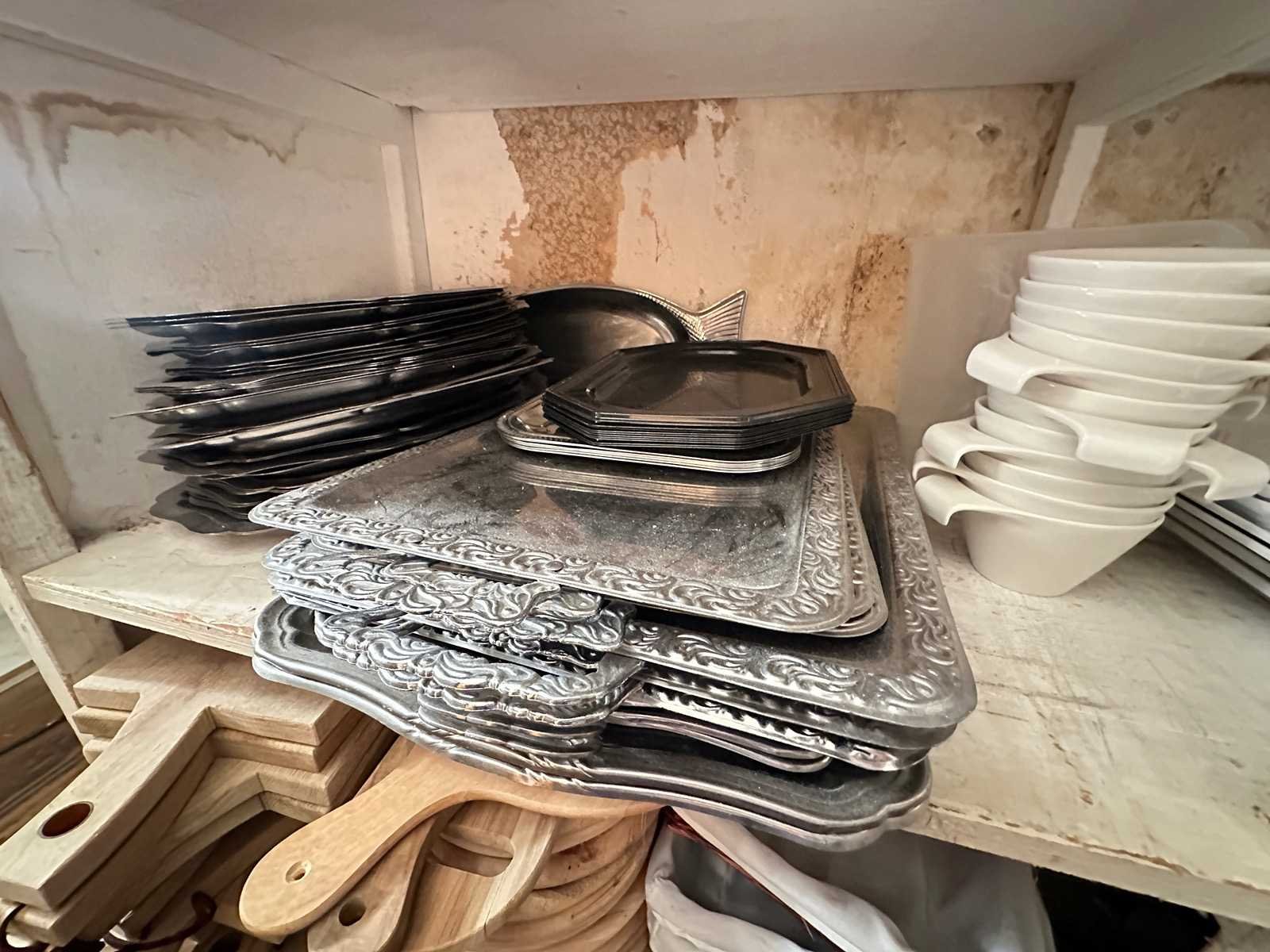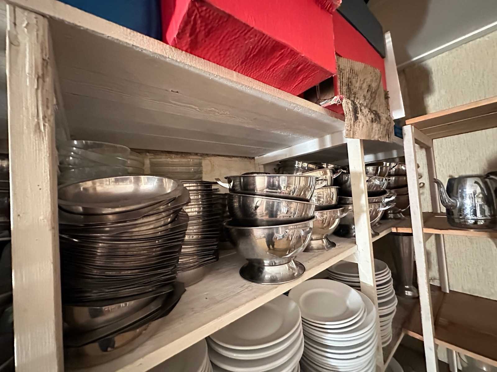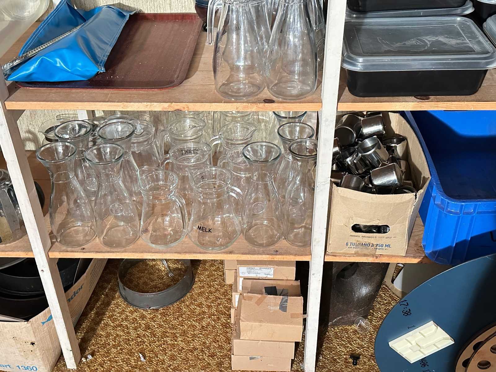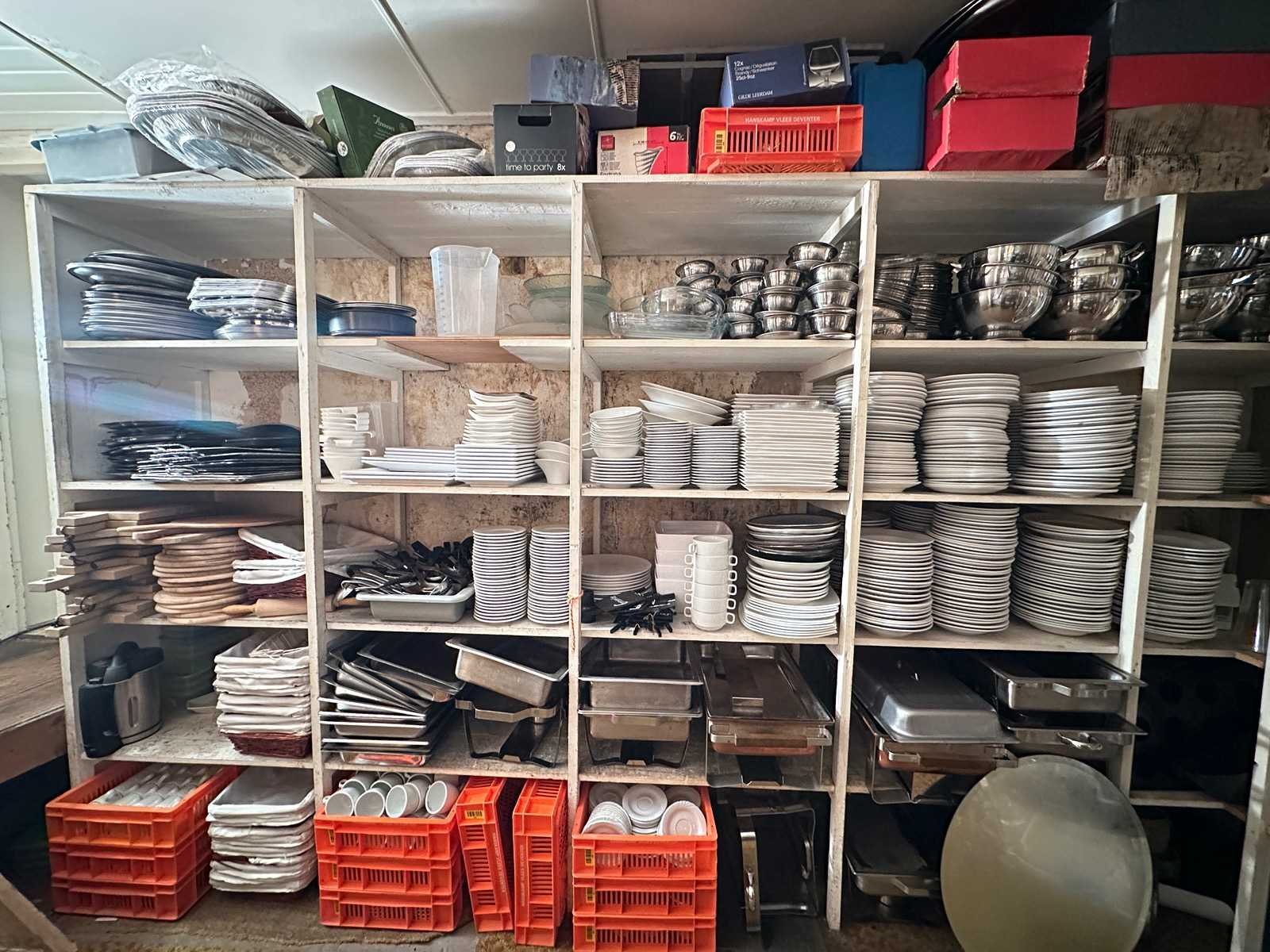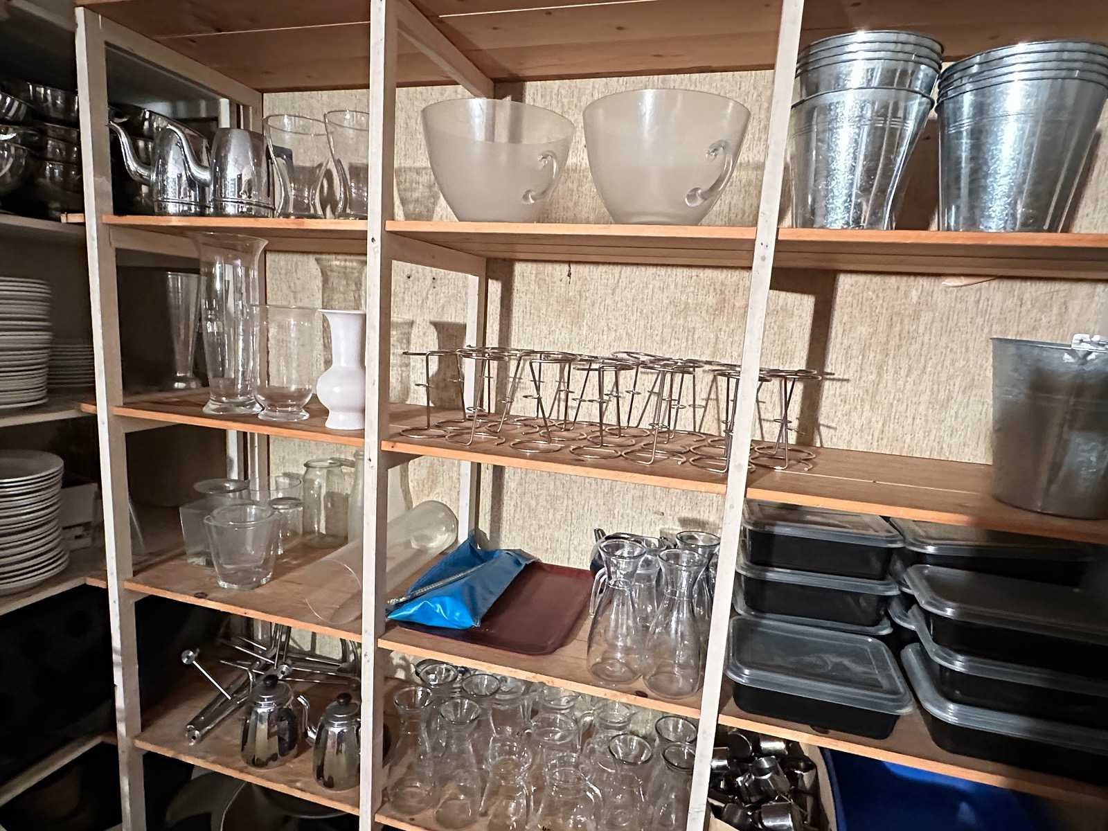 Deze inhoud bestaat uit serviesgoed, buffetbenodigdheden, vazen, houten planken en broodmanden.