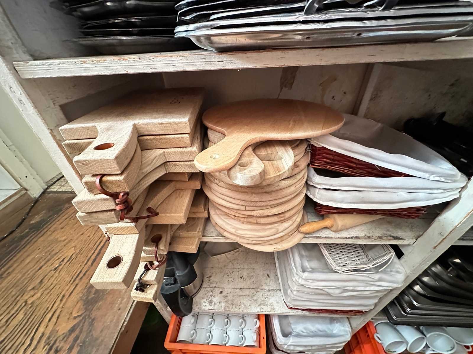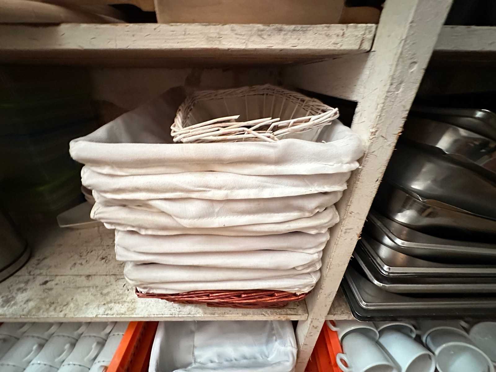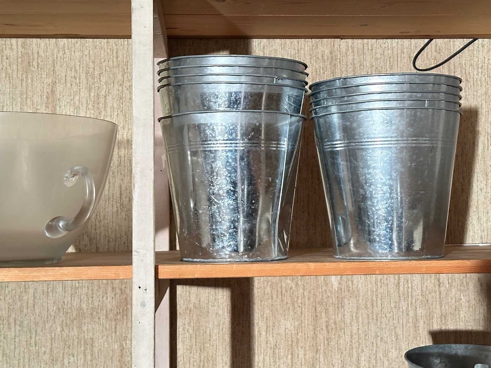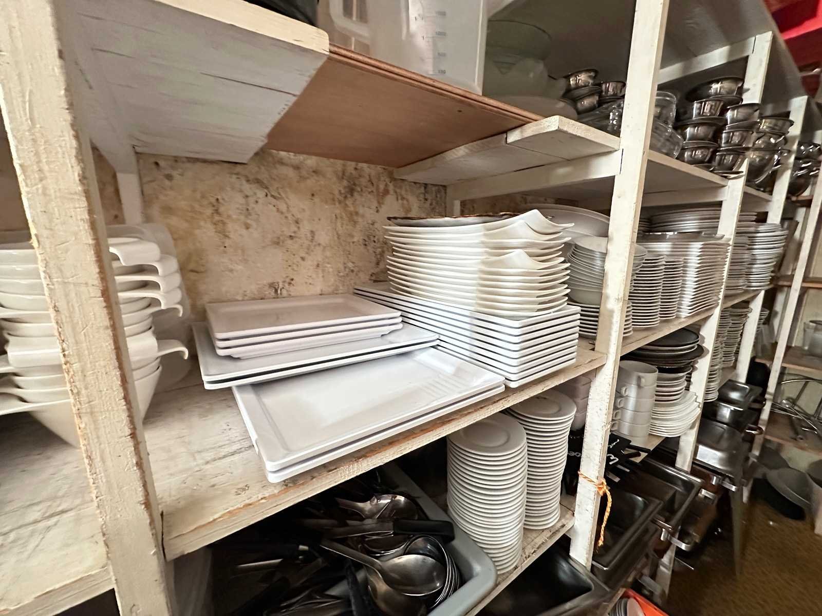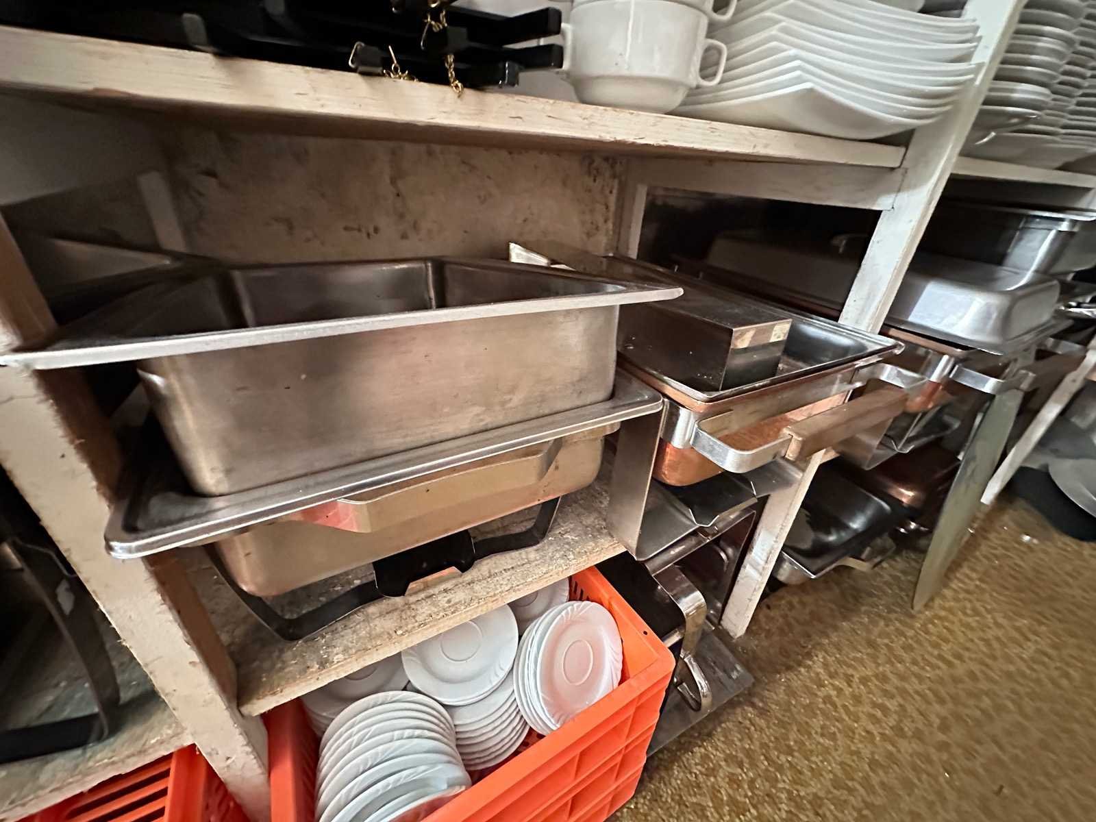Deze inhoud bestaat uit serviesgoed, buffetbenodigdheden, vazen, houten planken en broodmanden.