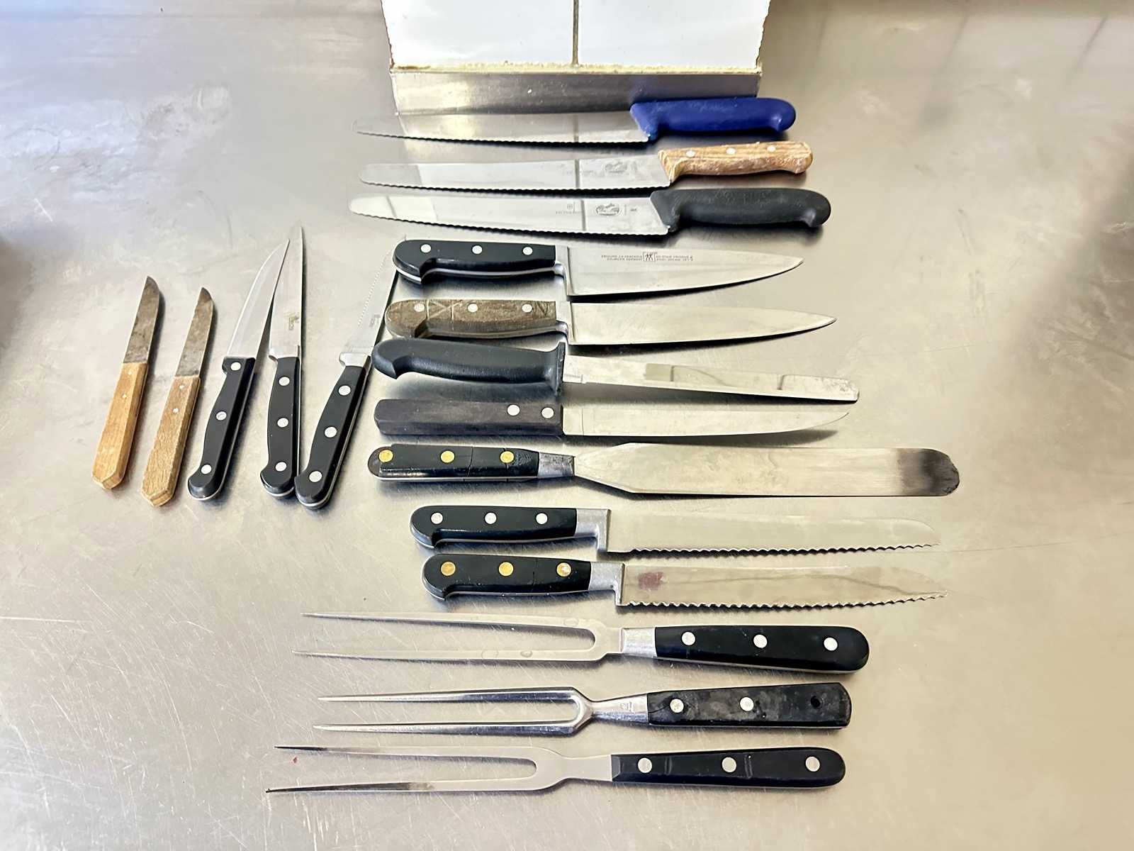 Deze partij bestaat uit koksmessen en vleesvorken. Inclusief gastronormbak.