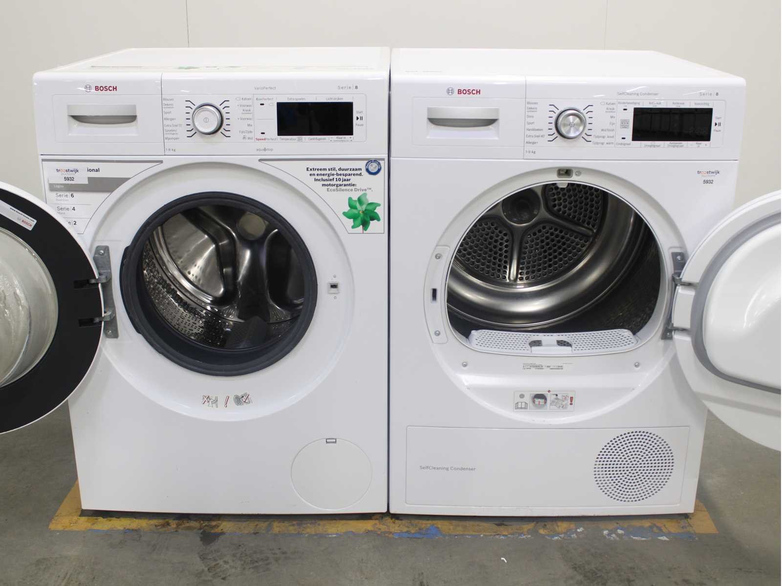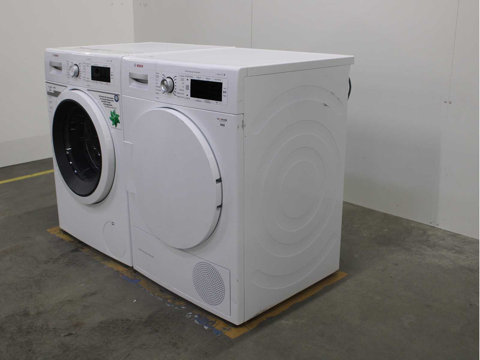 Deze wasmachine en wasdroger komen uit een partij jong gebruikt A-Merk witgoed. De machines zijn volledig getest, gereinigd en indien nodig gerepareerd. Houdt er rekening mee dat de machines lichte gebruikssporen kunnen hebben. Wasmachines en wasdrogers hebben vaak standaard afmetingen. Hoogte 85cm, Breedte 60cm en Diepte 60 tot 70cm, incl. uitstekende slangen e.d. aan de achterzijde. Als de machine vrij komt te staan is de afmeting minder relevant. Wil je de machine in een nis plaatsen of inbouwen? Controleer dan de exacte afmetingen op basis van het aangeboden merk en model/type. Within 7 days Merk: Bosch Serienummer: WAW28461NL/01 en WTW84562NL