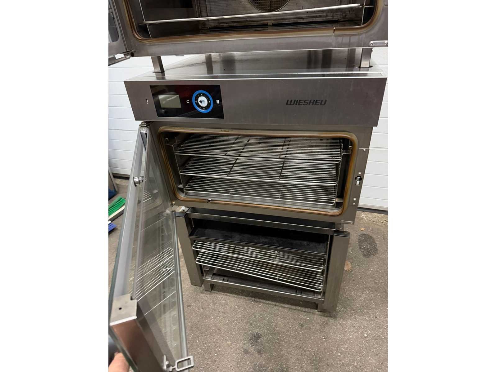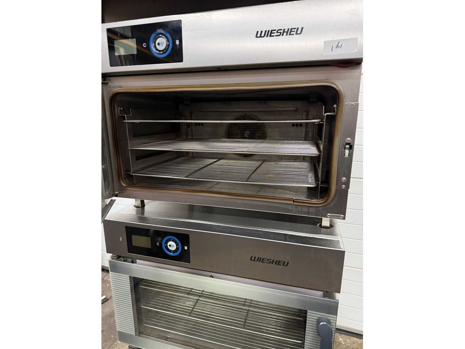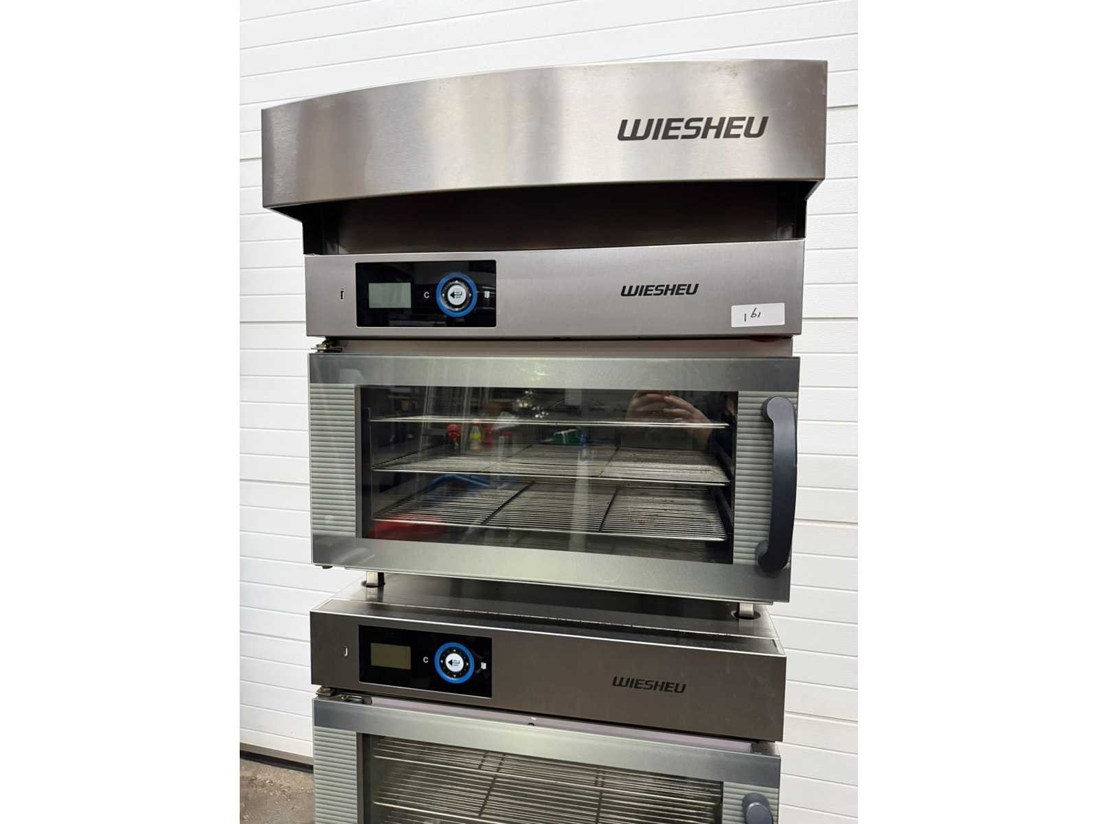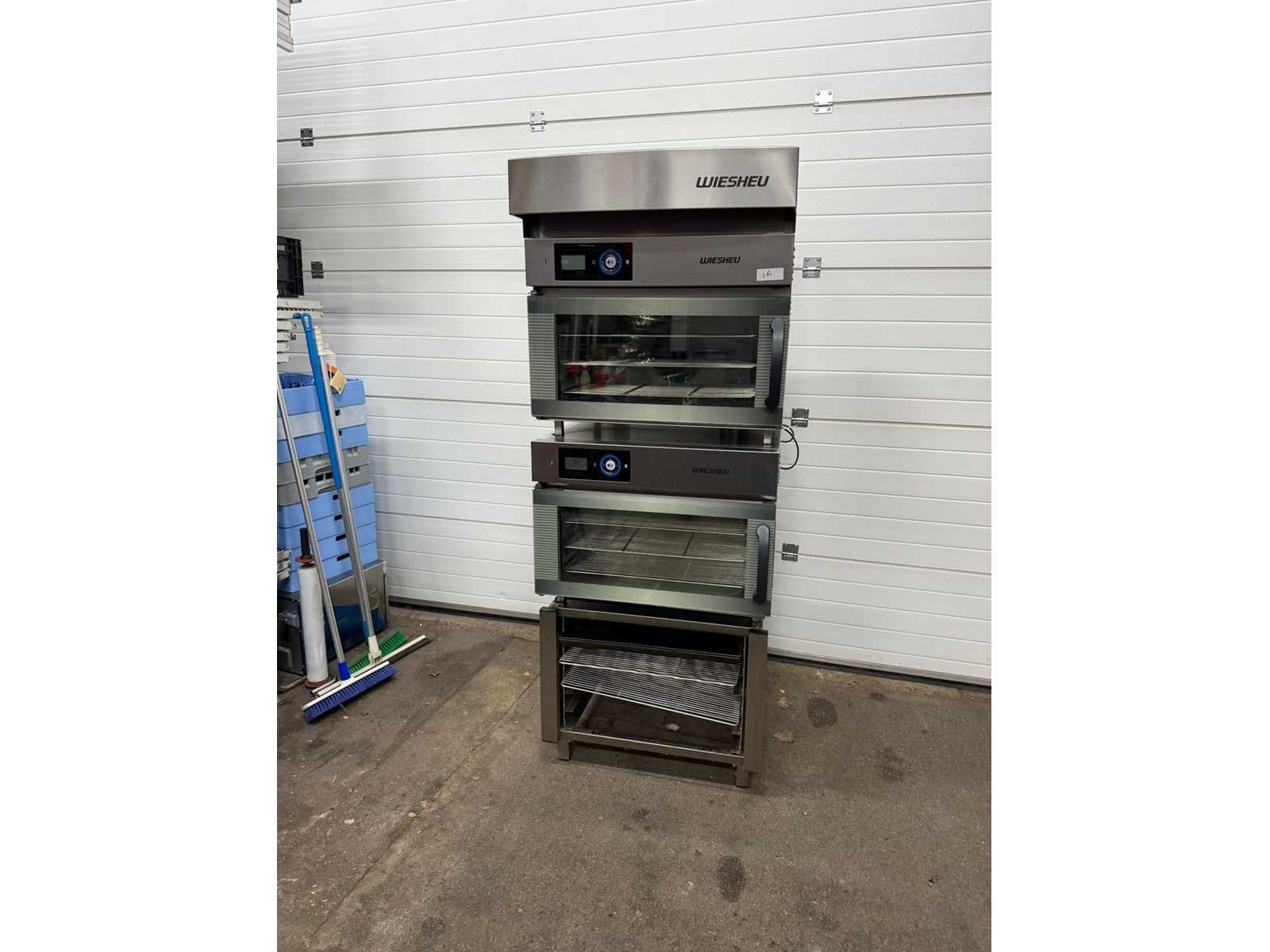 Dubbele oven 2x3 plaat. Compleet met onderstel roosters en afzuigkap. Merk: Wiesheu Type: Minimat 64-M Aansluiting: 400V Rvs: true Vermogen: 5.3kW Bouwjaar: 2018