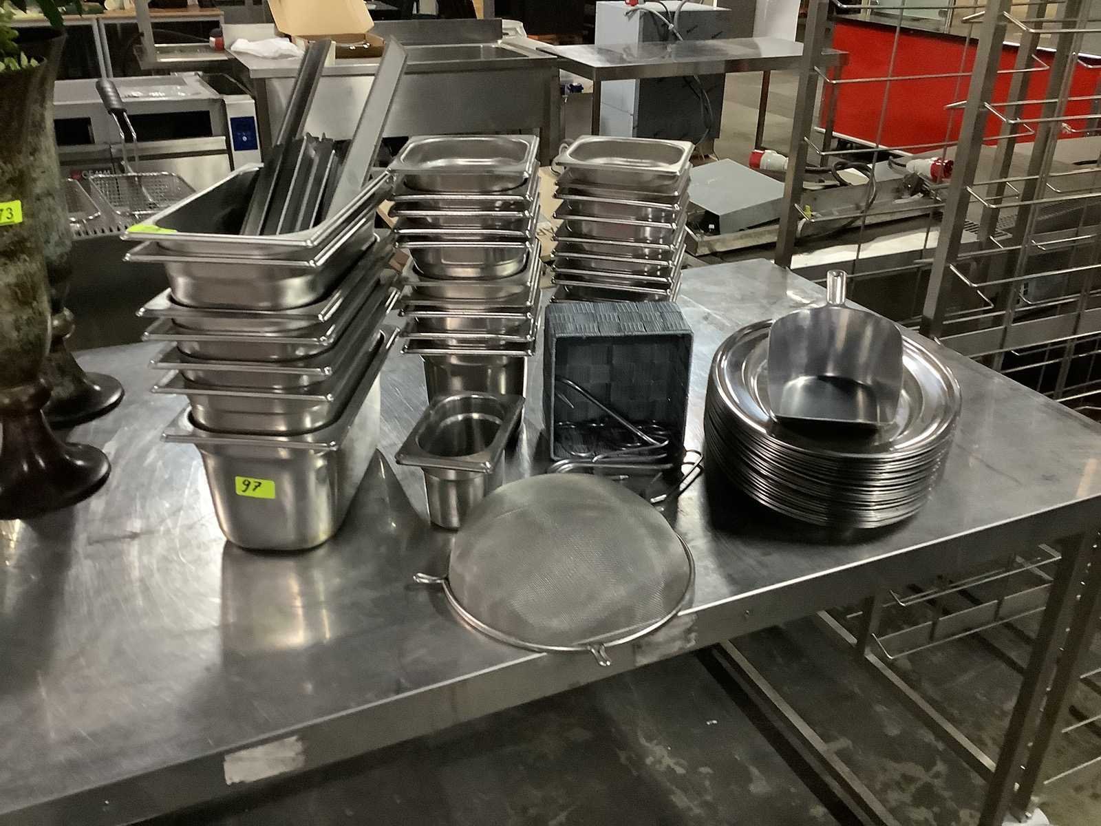 20x 1/6 GN verschillende hoogtes 1x 1/9 GN 7x 1/3 GN verschillende hoogtes 24x serveerplateau (46x29cm) Tussenliggers 9x vleeshaak 1x bolzeef 1x schep Materiaal: RVS