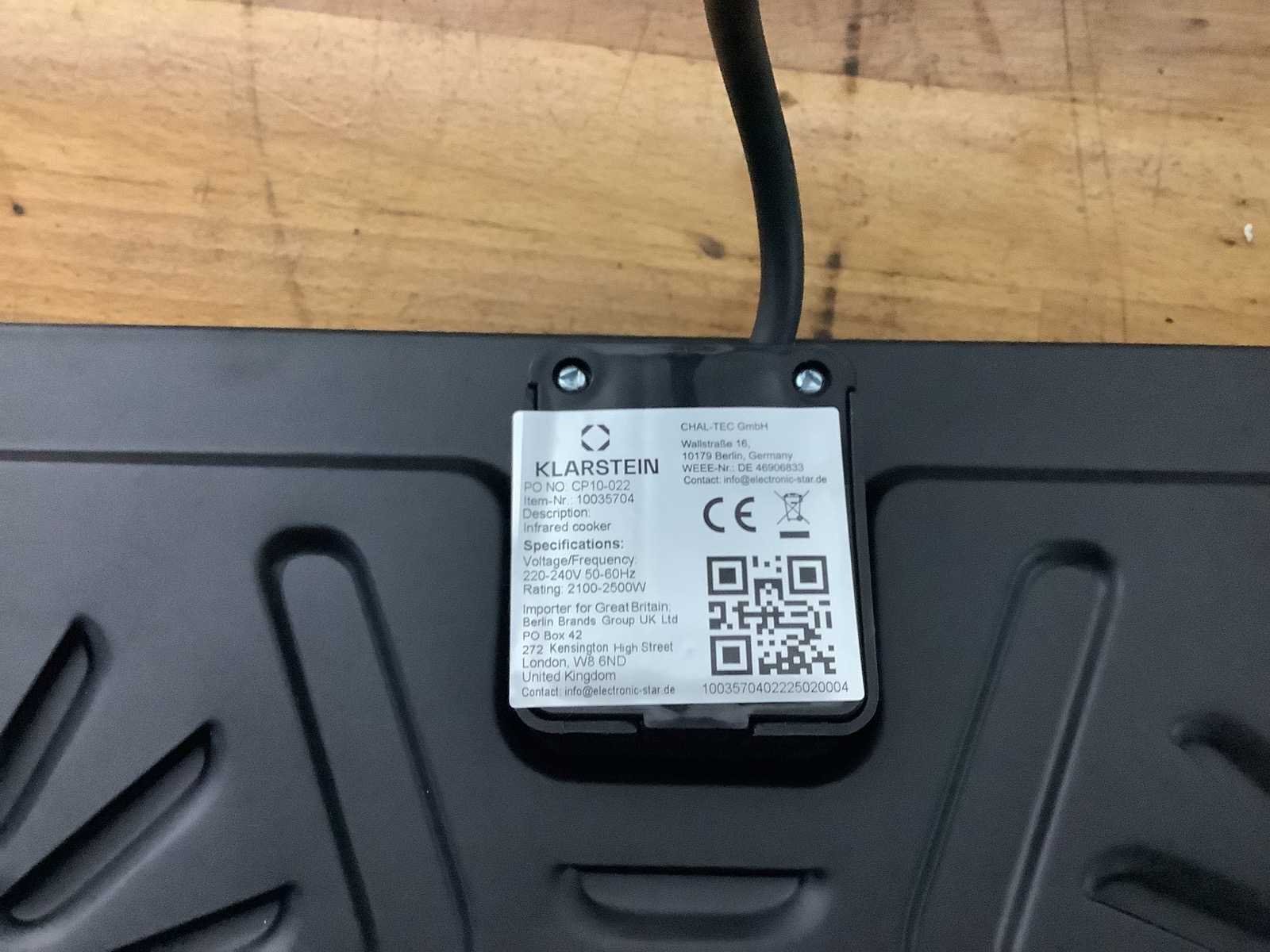 Merk: Klarstein Model: 10035704 Vermogen: 2500W Spanning: 240V Kleur: zwart Lengte: 500mm Breedte: 270mm Hoogte: 80mm