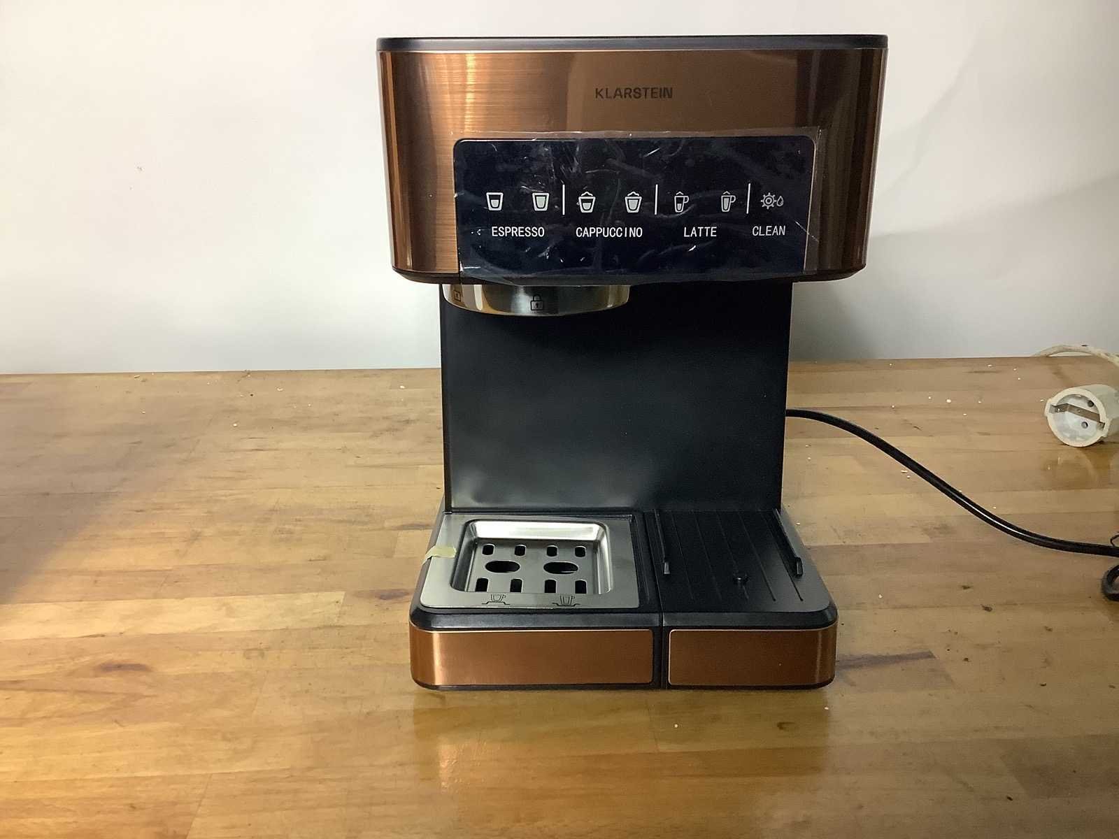 Merk: Klarstein Koffie- & espressomachine: true Kleur: Koper Lengte: 21cm Breedte: 29cm Hoogte: 38cm