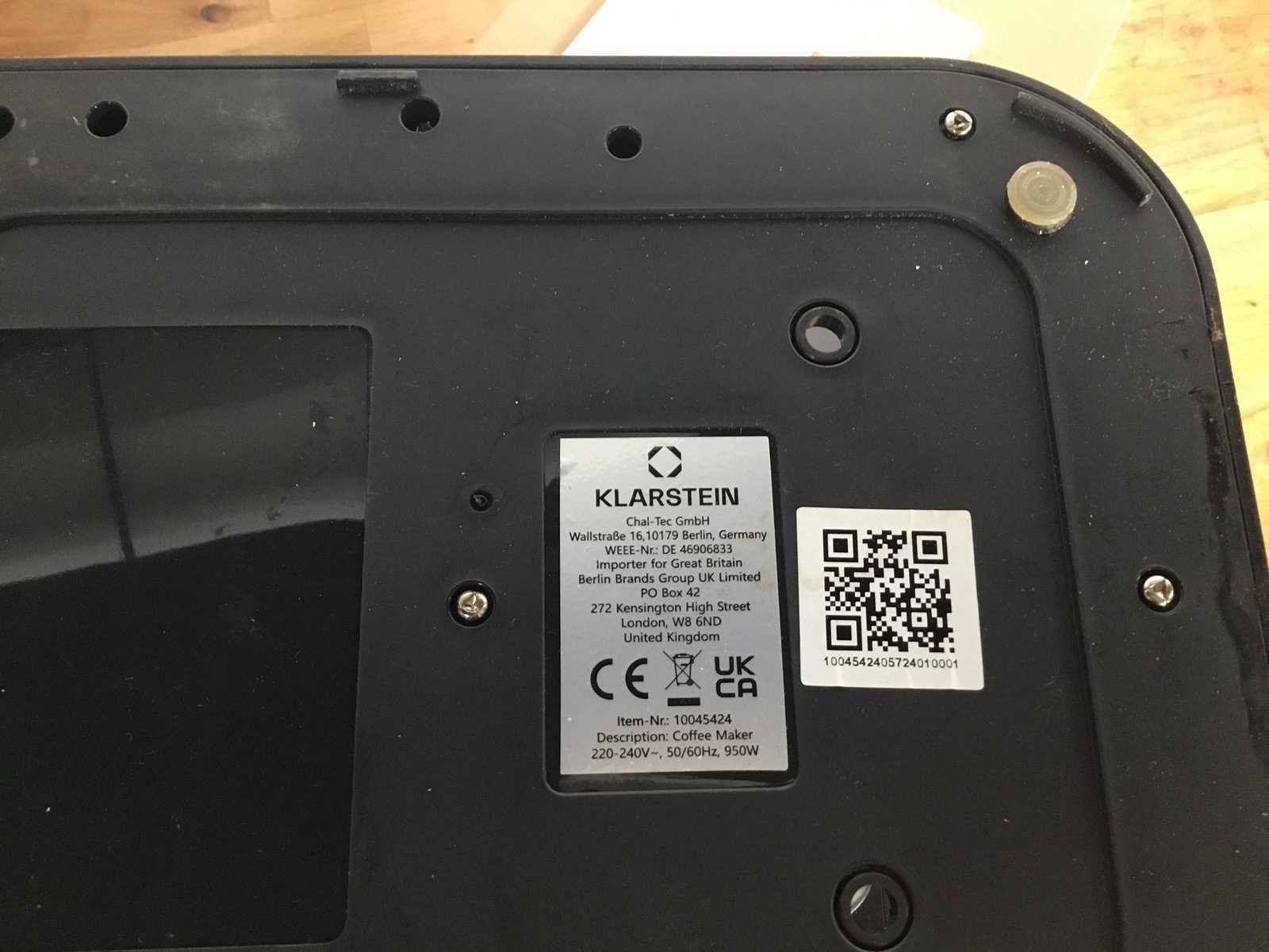Merk: Klarstein Model: 10045423 Koffie- & espressomachine: true Lengte: 22cm Breedte: 28cm Hoogte: 30cm