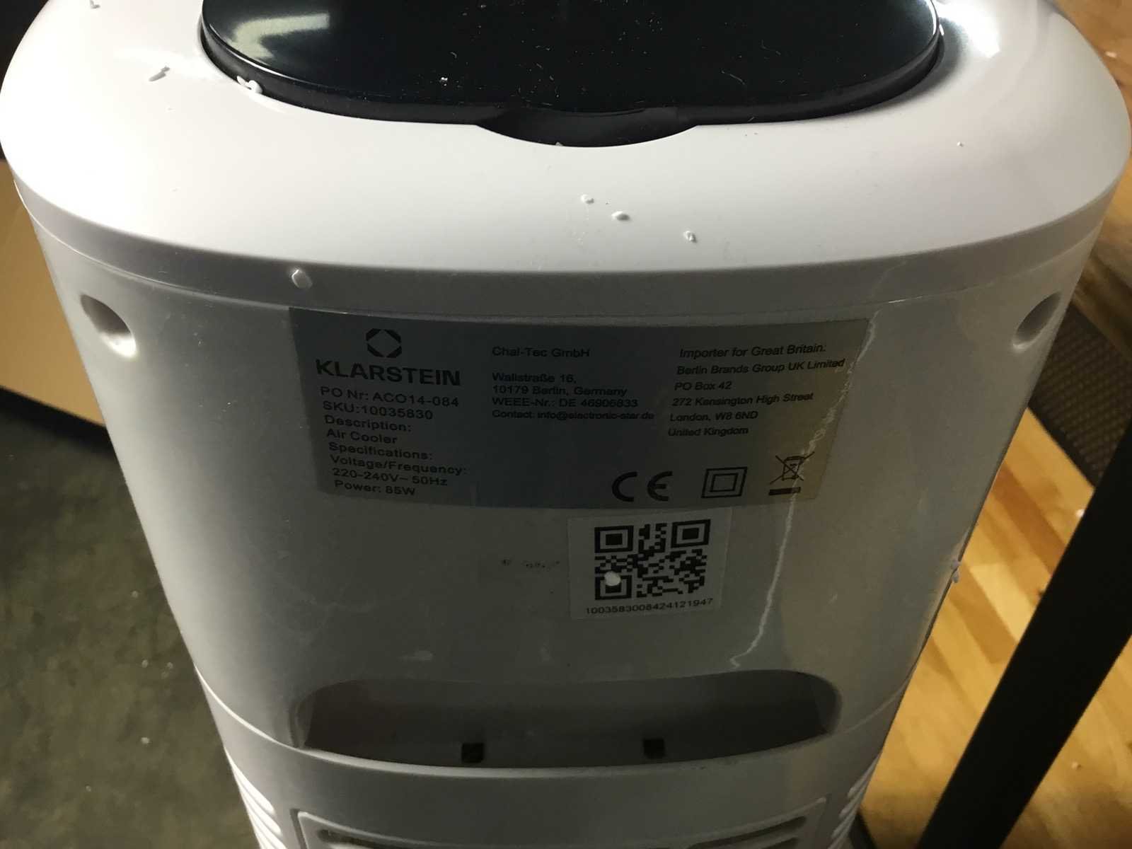 Merk: Klarstein Model: ACO-14-084 Spanning: 230V Lengte: 32cm Breedte: 23cm Hoogte: 110cm