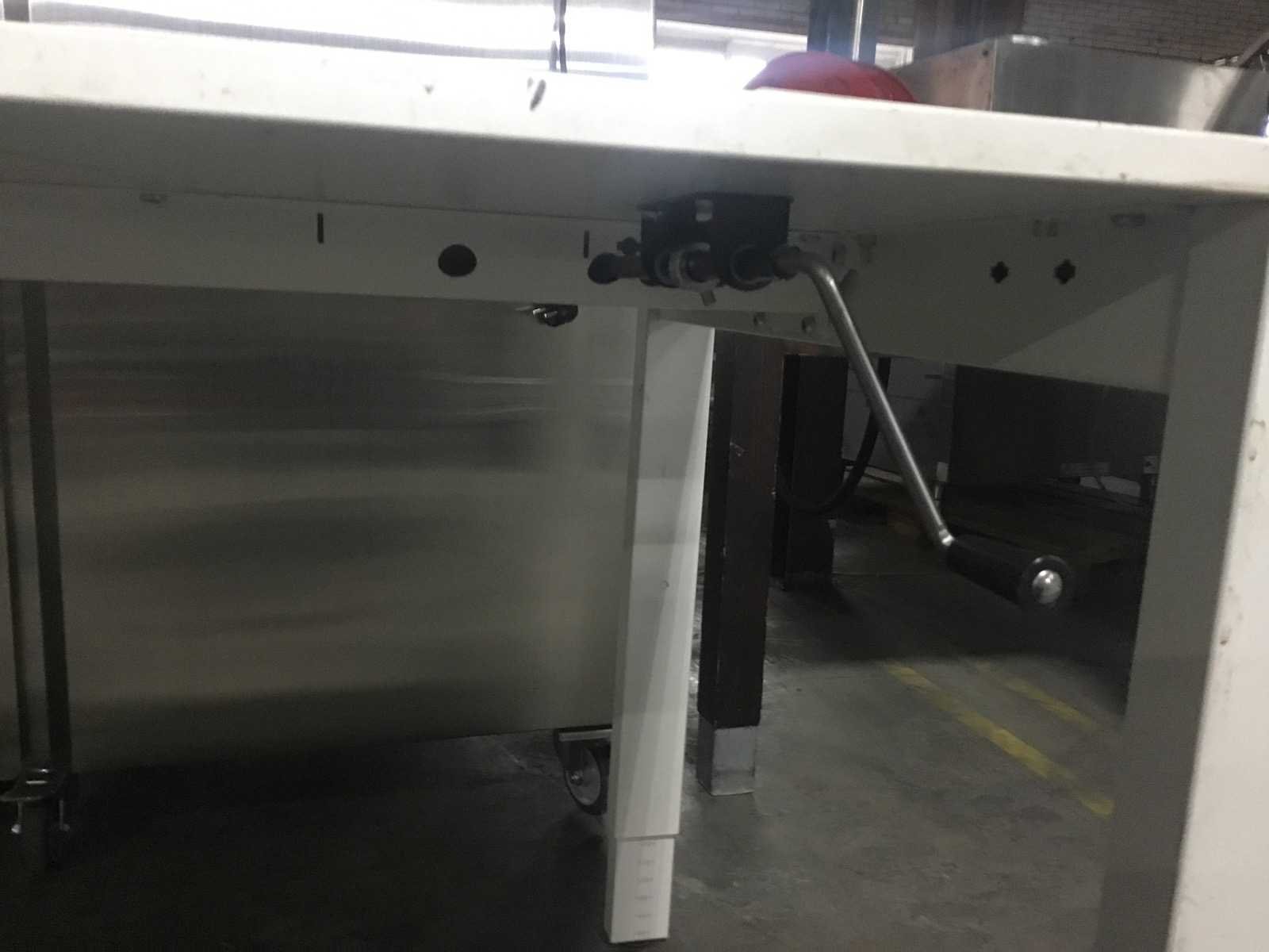In hoogte verstelbaar door middel van draaiarm. Blad lichte beschadiging zie foto Type: Bureau Kleur: Wit Lengte: 160cm Breedte: 80cm Hoogte: 80cm