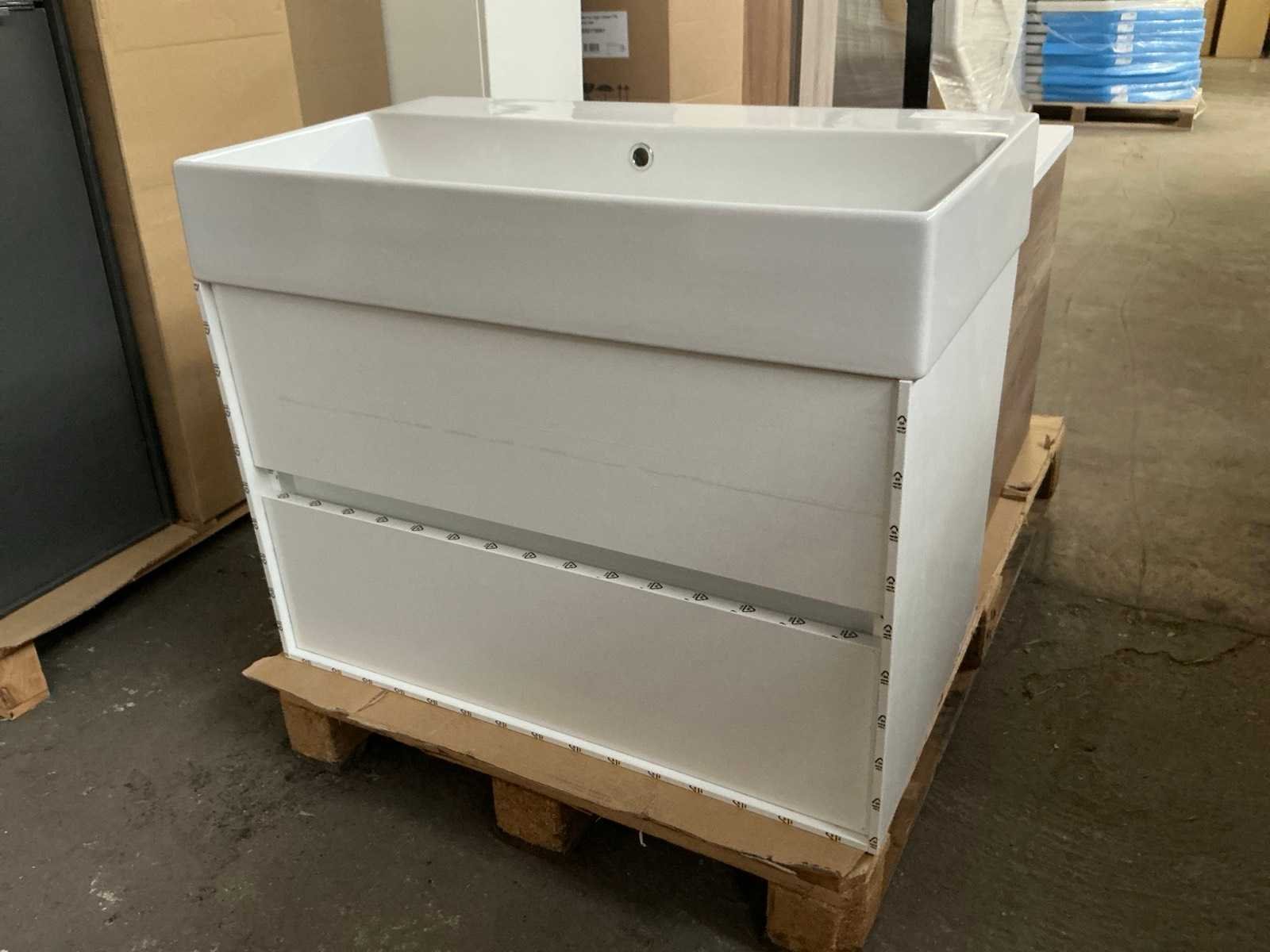 Merk: MB Model: Pescara Hoogte: 64cm Lengte: 80cm Breedte: 45cm Materiaal: Houtfineer en keramiek Kleur: Wit hgl Wastafel: Ja met waste Onderkast: Ja Lades: 2 Softclose: true