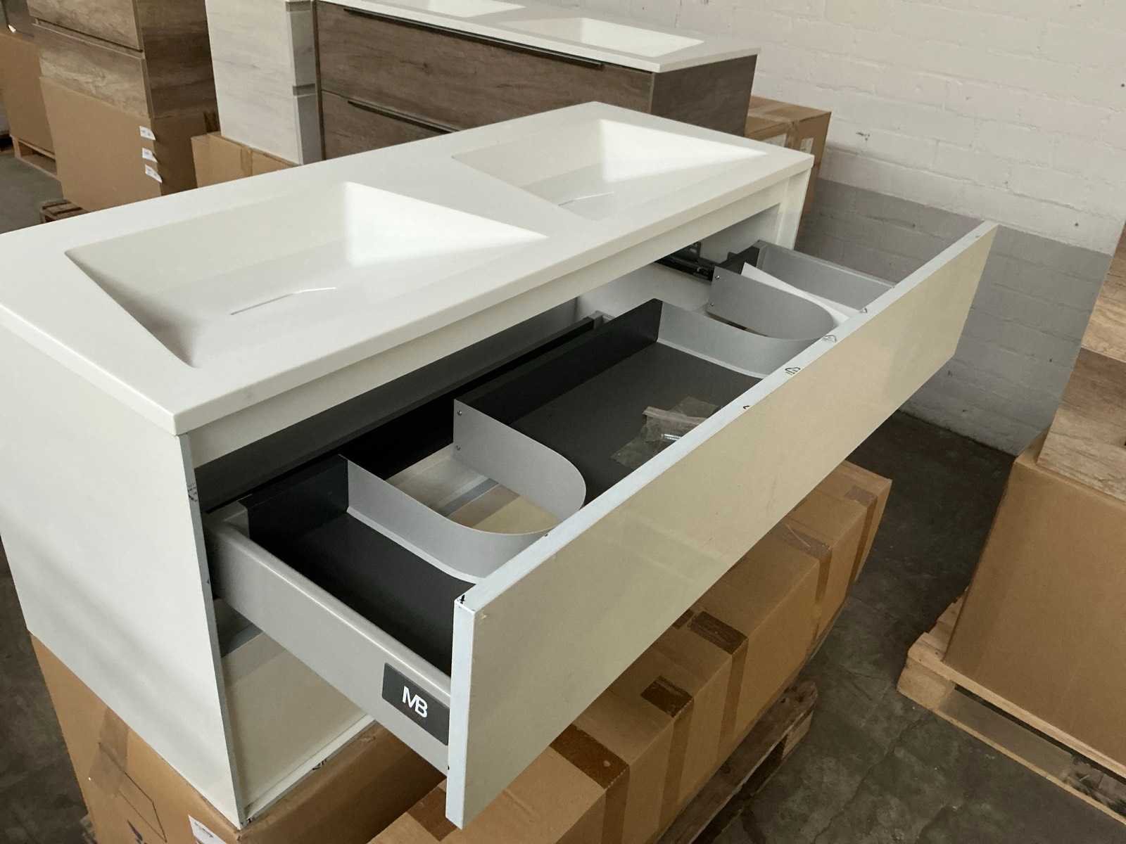 Merk: MB Model: Pescara Hoogte: 54cm Lengte: 120cm Breedte: 46cm Materiaal: Hout Kleur: Wit Wastafel: Ja, 2 spoeldelen Lades: 2 Softclose: true