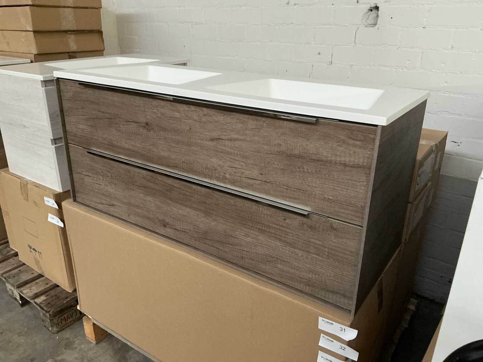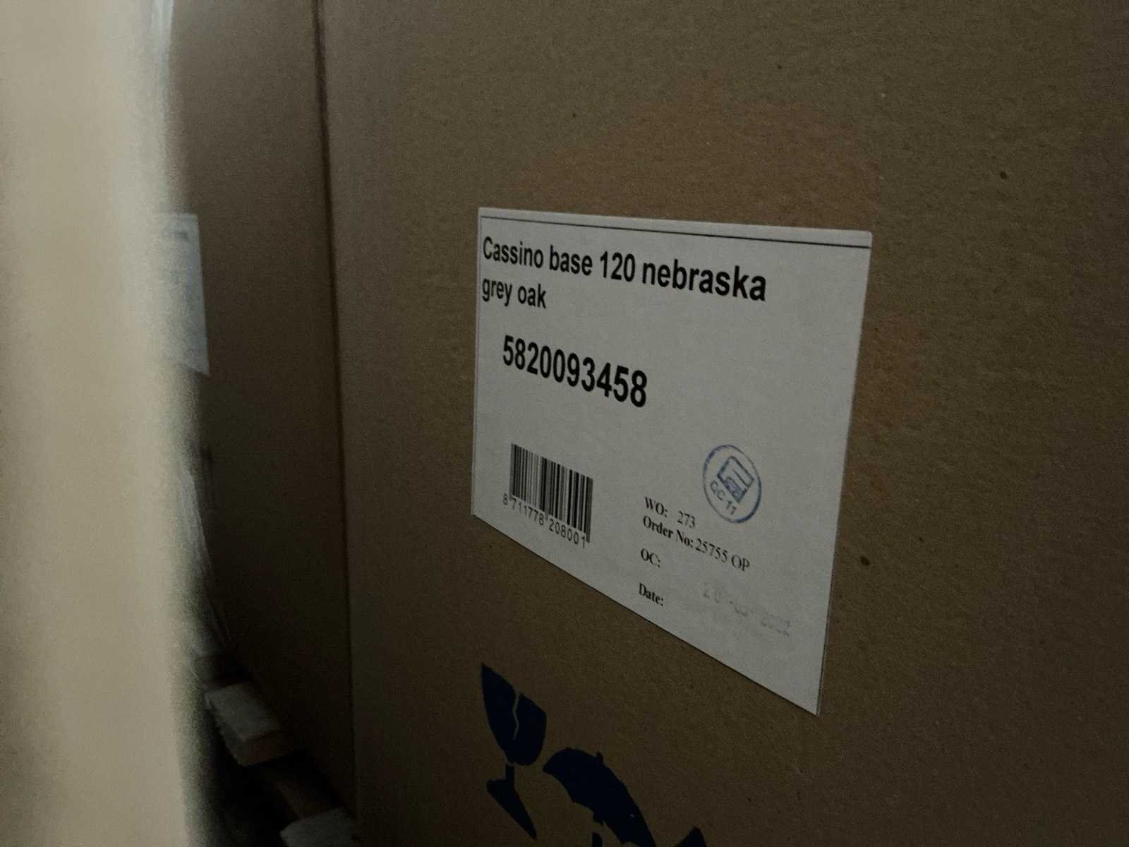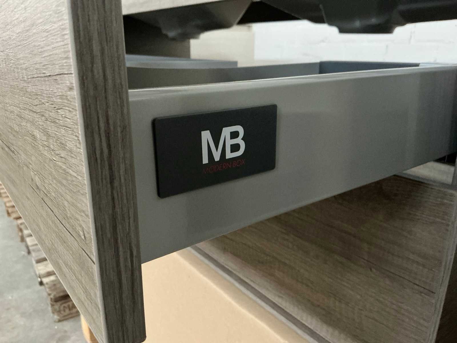 Model: Cassino Hoogte: 53cm Lengte: 120cm Breedte: 46cm Materiaal: Hout Kleur: Nabraska grey oak Wastafel: Ja, 2 spoelbakken mat wit Onderkast: Ja Lades: 2 Softclose: true