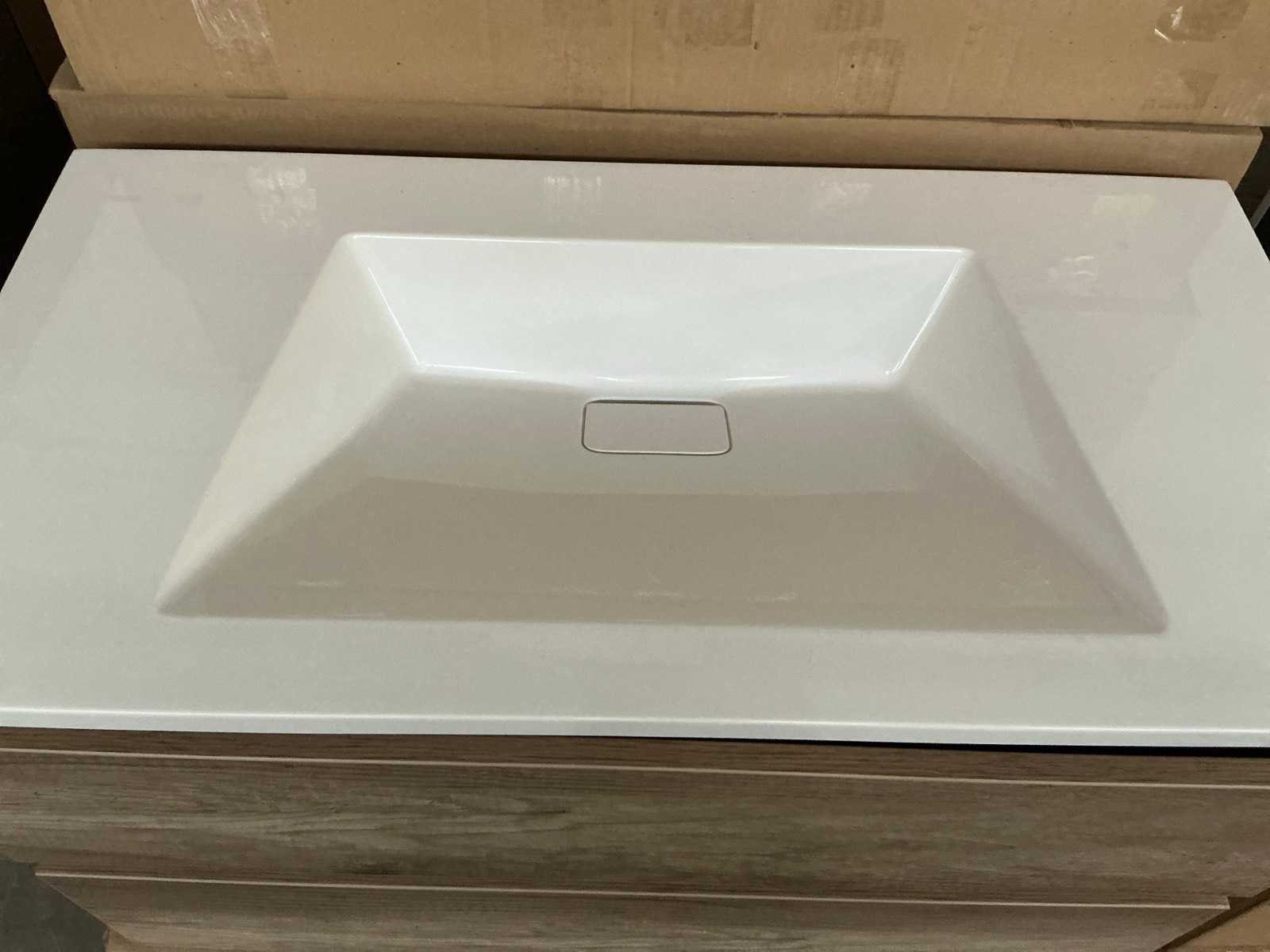 Merk: MB Model: Alvaro Hoogte: 52cm Lengte: 90cm Breedte: 46cm Materiaal: Hout en keramiek Kleur: Canyon oak Wastafel: Ja, 1 spoeldeel Onderkast: Ja Lades: 2 Softclose: true