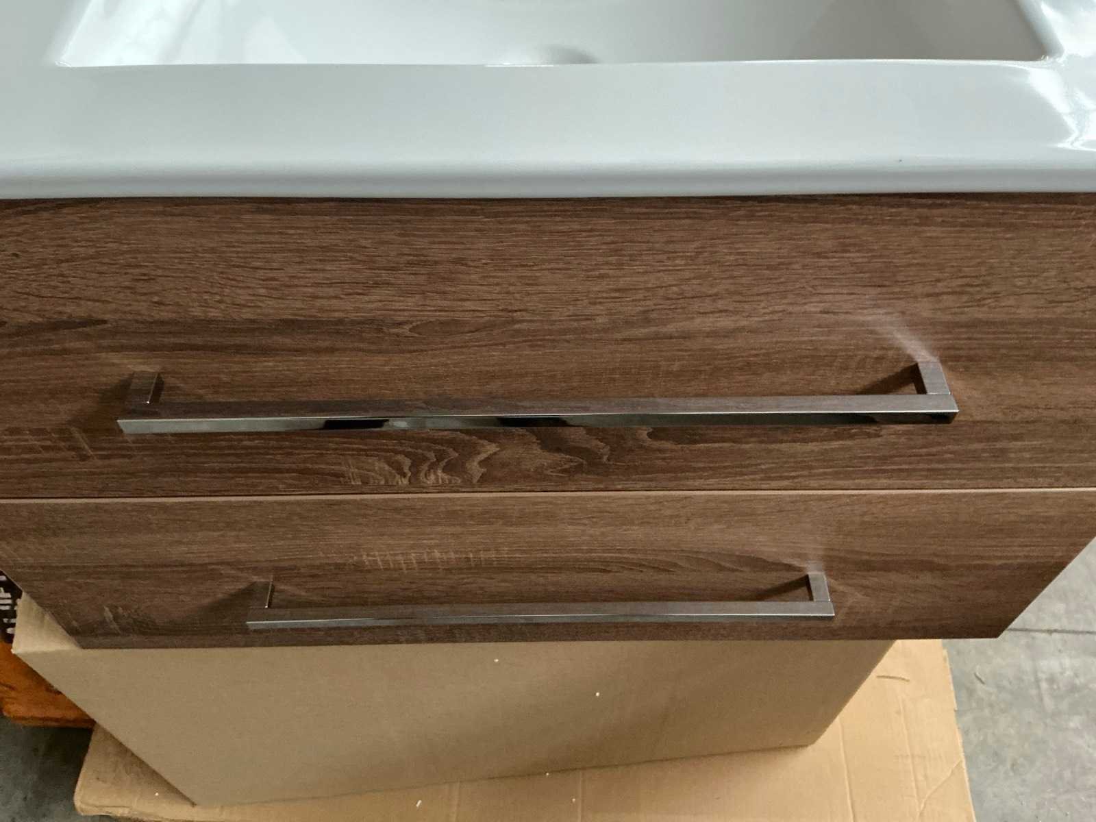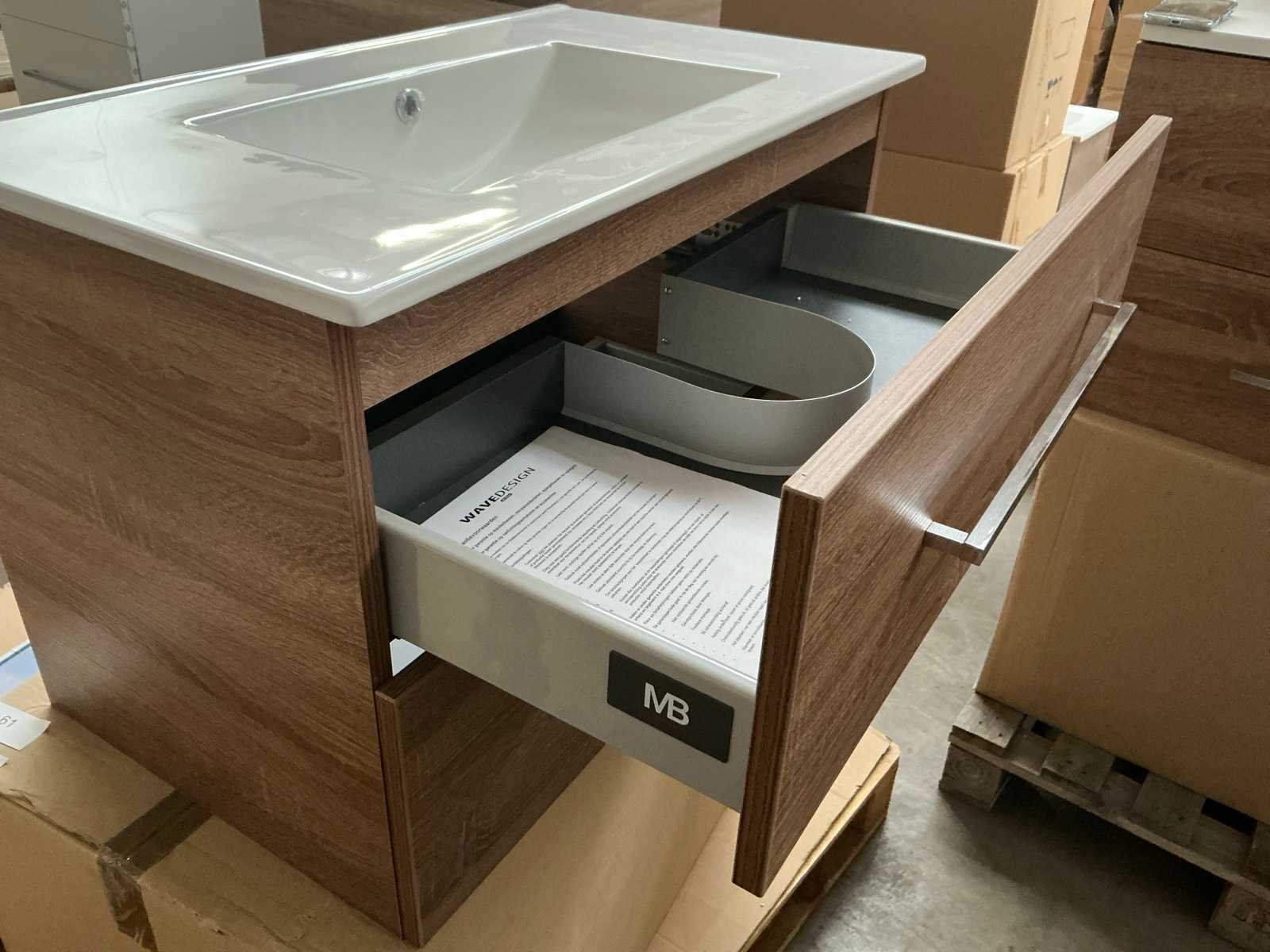 Merk: MB Model: San Marino Hoogte: 52cm Lengte: 80cm Breedte: 46cm Materiaal: Hout en keramiek Kleur: Sanoma Oak Wastafel: Ja, geen kraangat Onderkast: Ja Lades: 2 Softclose: true