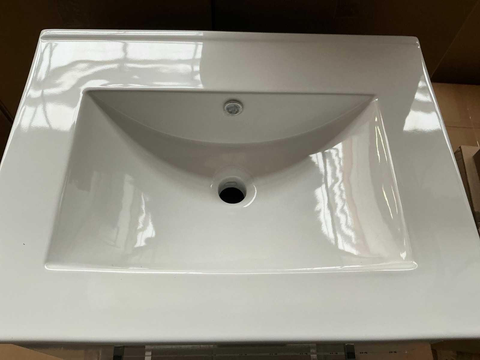 Merk: MB Model: San Marino Hoogte: 52cm Lengte: 60cm Breedte: 47cm Materiaal: Hout en keramiek Kleur: White hgl Wastafel: Ja, geen kraangat Onderkast: Ja Lades: 2 Softclose: true