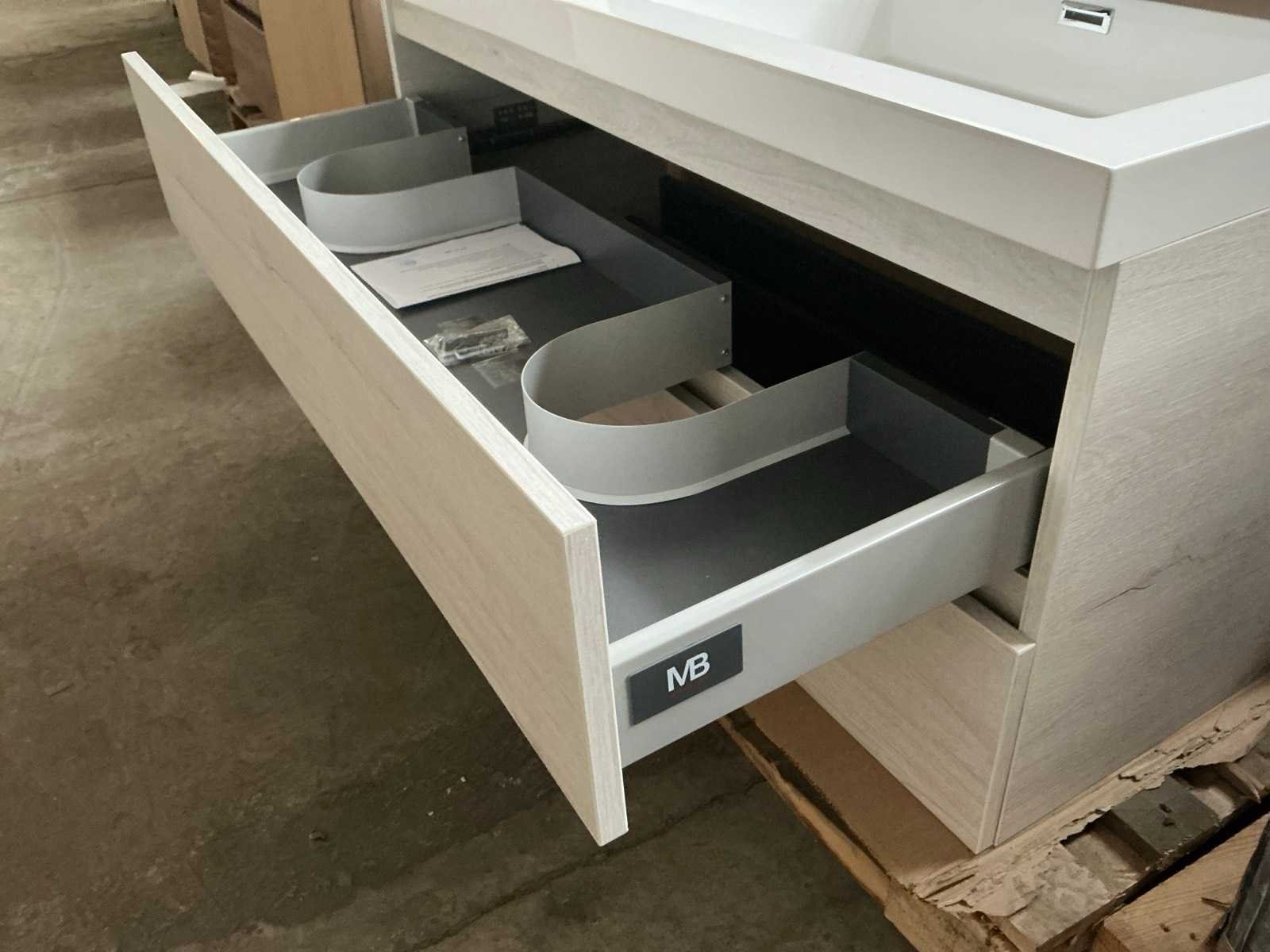 Merk: MB Model: Alvaro Hoogte: 56cm Lengte: 120cm Breedte: 46cm Materiaal: Hout Kleur: Arwin Oak Wastafel: 2 spoelbakken met kraangat en waste Onderkast: Ja Lades: 2 Softclose: true