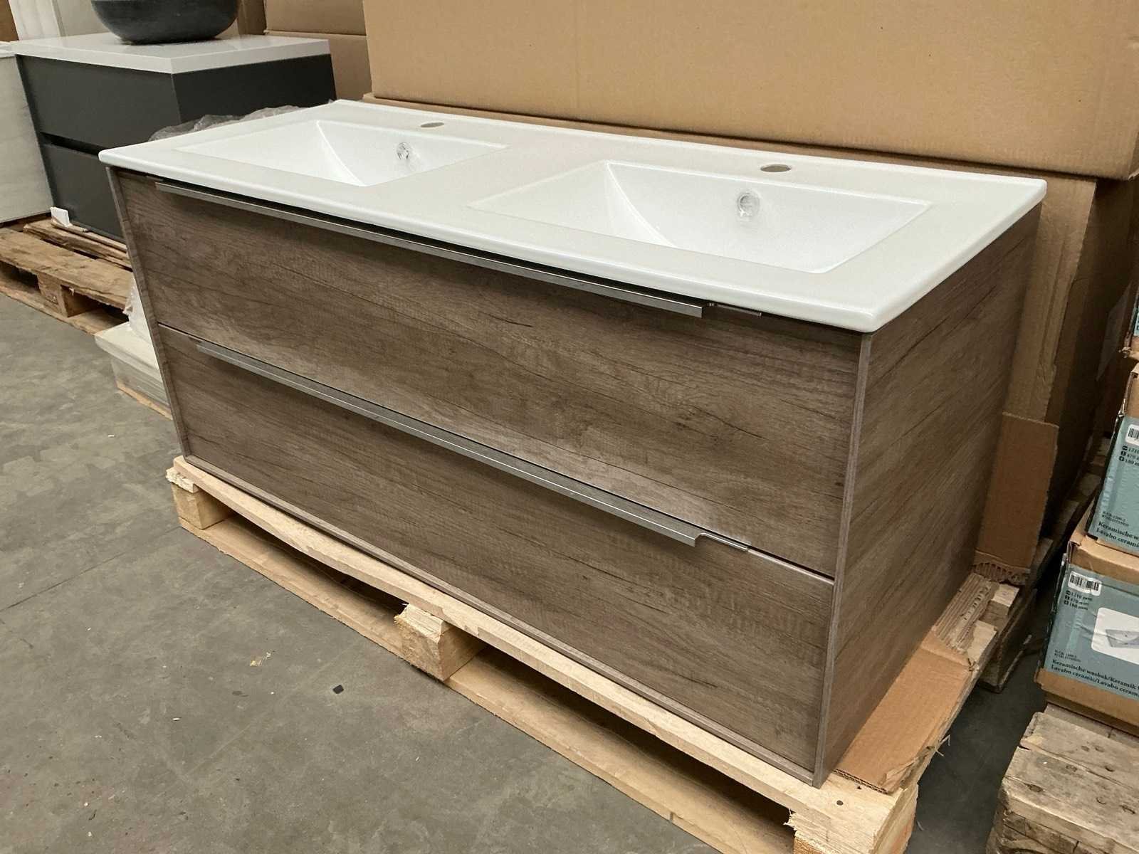 Merk: MB Model: Cassino Hoogte: 51cm Lengte: 121cm Breedte: 46cm Materiaal: Houtfineer Kleur: Nebraska grey Oak Wastafel: Ja, 2 spoelbakken Lades: 2 Softclose: true