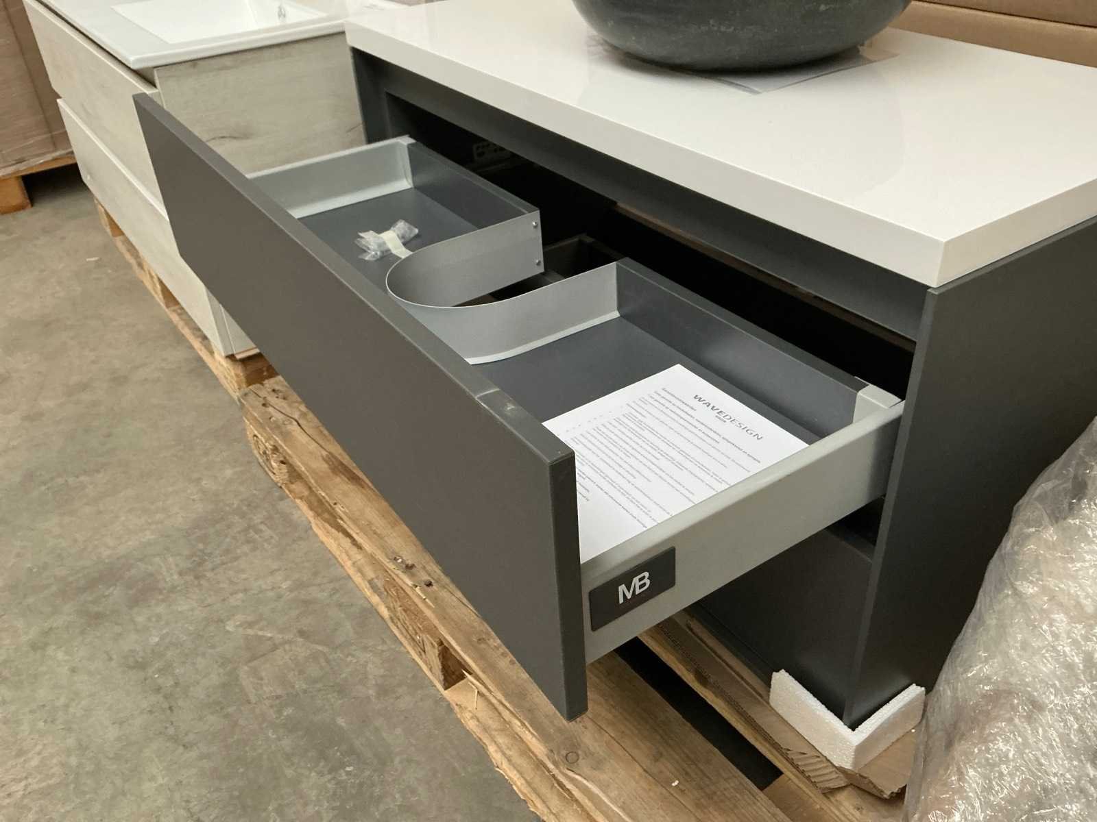 Merk: MB Hoogte: 55cm Lengte: 100cm Breedte: 46cm Materiaal: Houtfineer Kleur: Grijs mat Waskom: Ja, 40cm Onderkast: Ja Lades: 2 Softclose: true