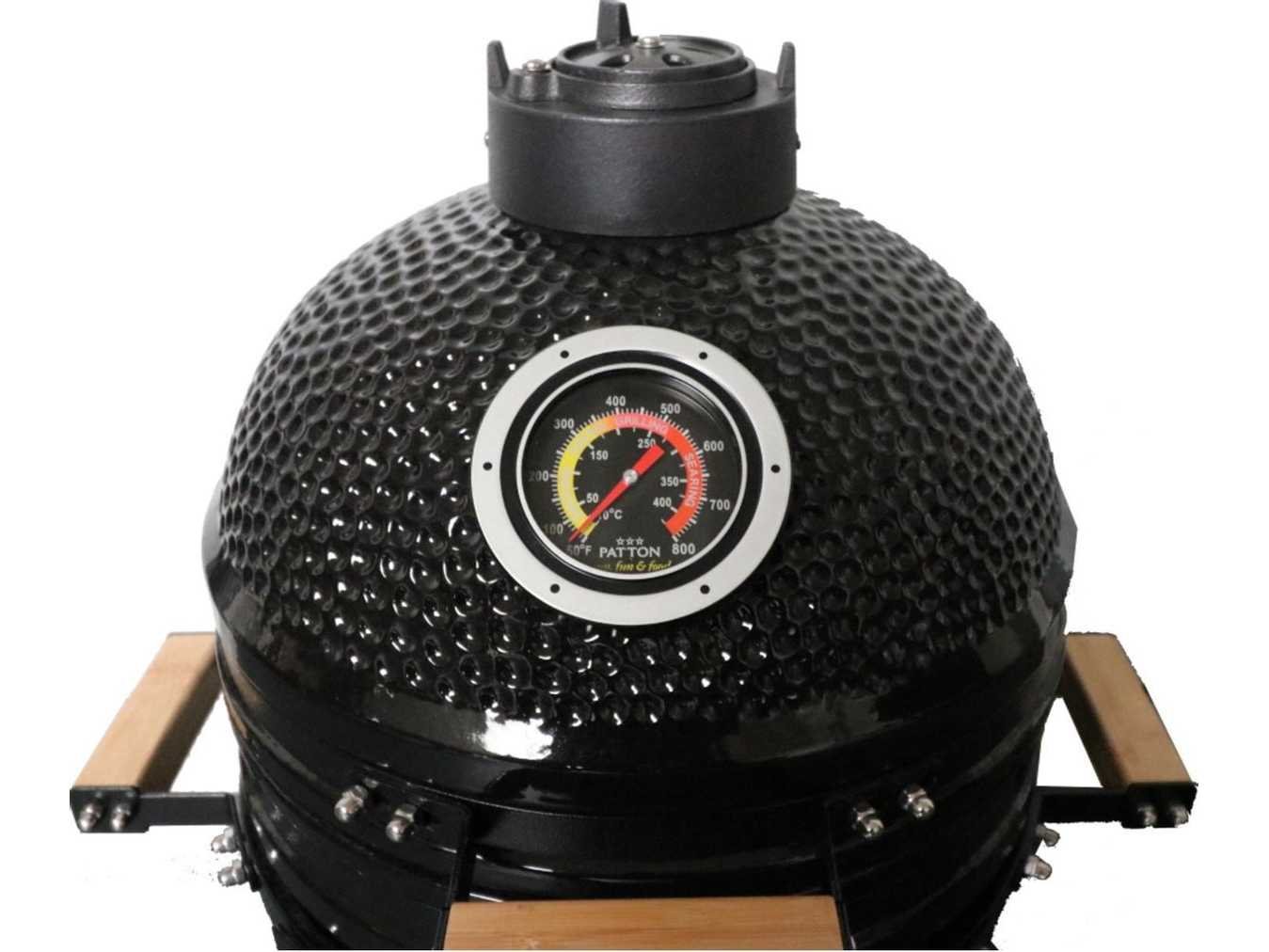 Kenmerken: • Kleur: oranje • Uitvoering 15”; Diameter grilloppervlak 34 cm. • Hoogwaardig geglazuurd industrieel keramiek, welke bestand is tot temperaturen van zo’n 1.000 graden Celsius. • Dankzij de keramische schaal en gecontroleerde luchtstroom wordt het vlees of ander gerecht sappiger en malser dan in welke andere stalen barbecue ook ! • Vanwege het ventilatierooster aan de onderzijde i.c.m. met de zgn. margrietschijf aan de bovenzijde is de temperatuur uitermate goed te controleren en in te regelen. • 15” uitvoering standaard uitgevoerd met degelijk onderstel • Middels de temperatuur meter op het deksel is de temperatuur goed te volgen Merk: Patton Model: 15 inch zwart (55CCE208) Kleur: Oranje Materiaal: keramiek