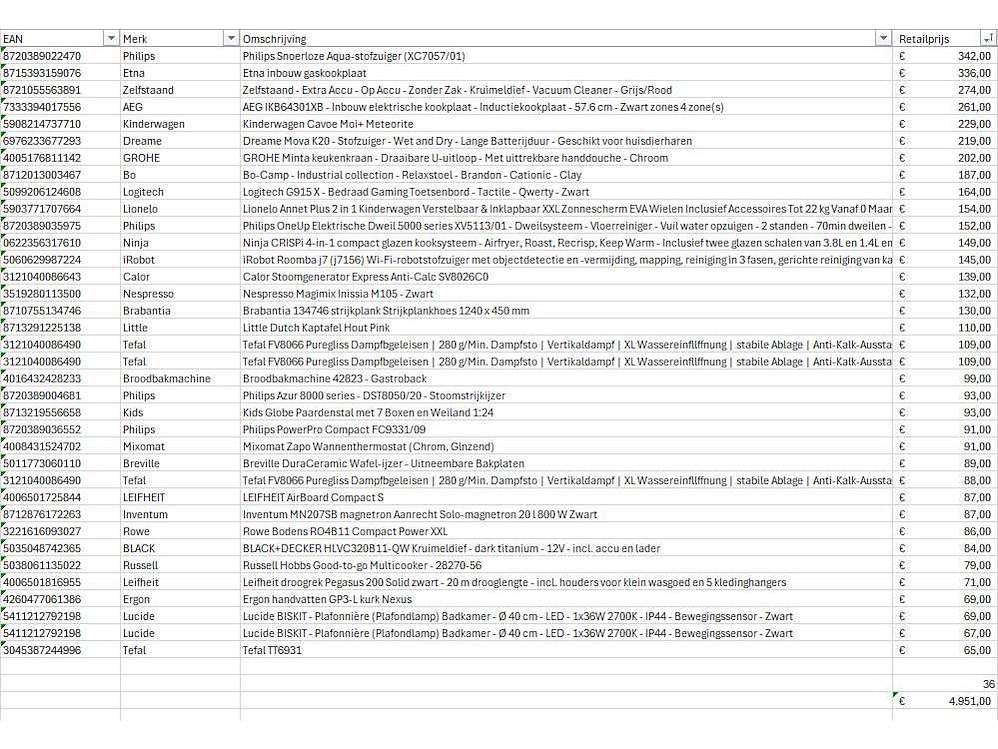 Dit betreft een partij A-merk retourgoederen van een grote online retailer. De partij bestaat uit diverse productcategorieën. Aantal stuks: 36. Retailwaarde: €4.951,- Ongecontroleerd: werking onbekend (mix van werkend, incompleet, beschadigd, te gebruiken voor onderdelen). Kom op de kijkdag om te om zo een goed beeld te krijgen van de reden van retour. Zie foto's voor lijst met inhoud. Bezorgtermijn 14 dagen Merk: Pallet Retourgoederen