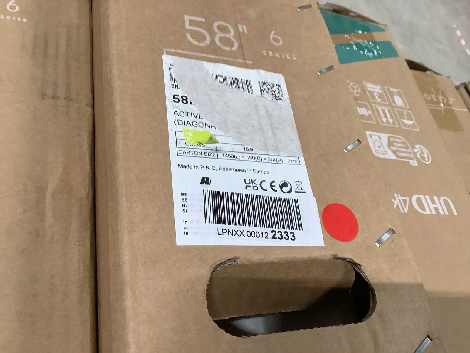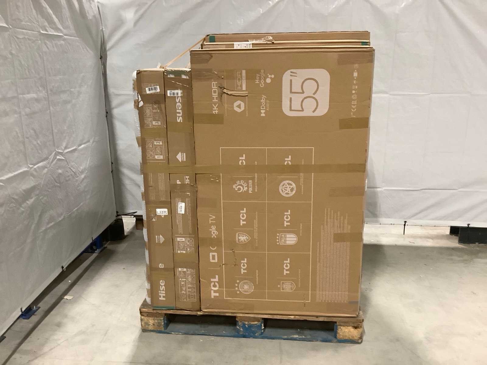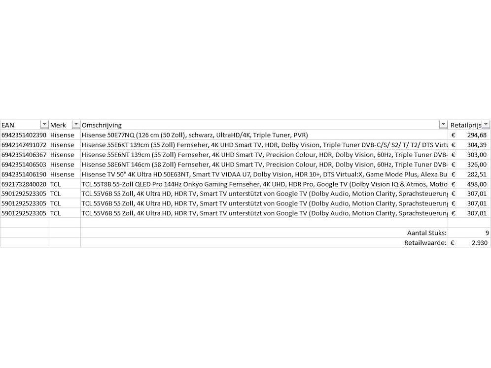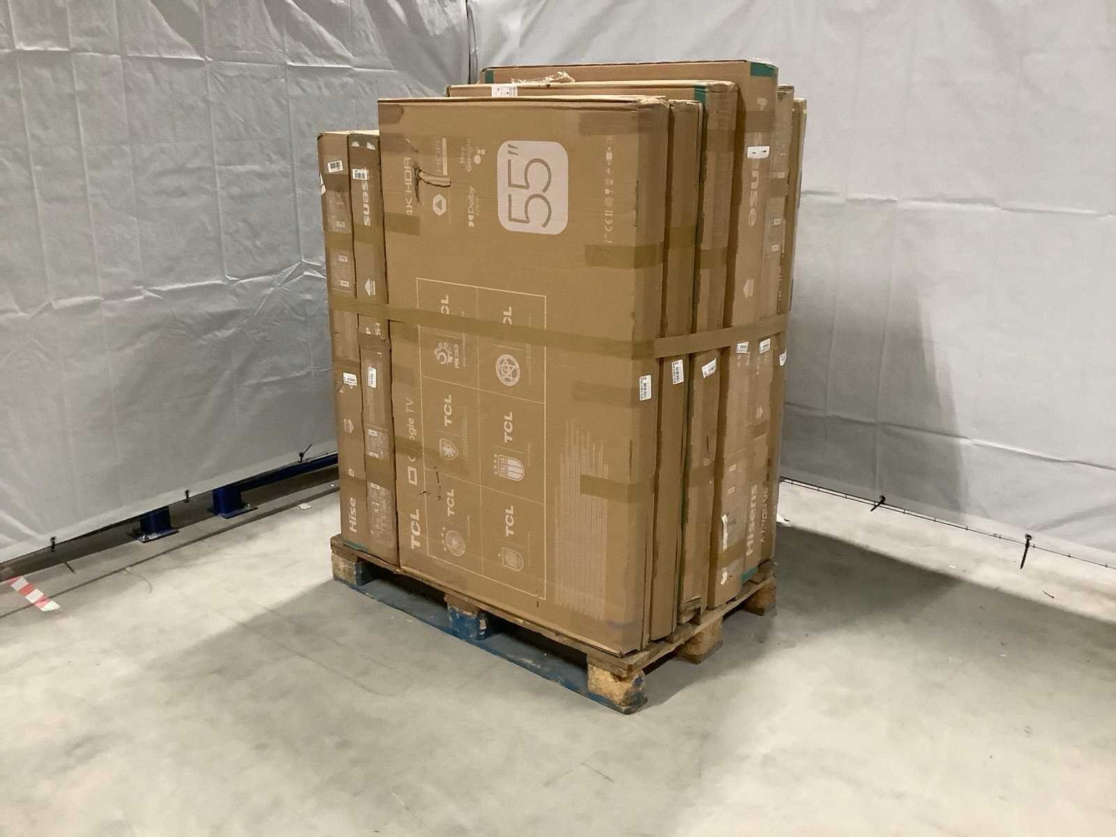 Dit betreft een partij televisies retourgoederen van een grote online retailer. De partij bestaat uit diverse diverse maten televisies. Aantal stuks: 9. Retailwaarde: €2930,- De televisies zijn niet werkend en zijn te gebruiken voor onderdelen. Kom op de kijkdag om te om zo een goed beeld te krijgen van de reden van retour. Zie foto's voor lijst met inhoud. Bezorgtermijn 14 dagen Merk: Pallet Retourgoederen - Televisies
