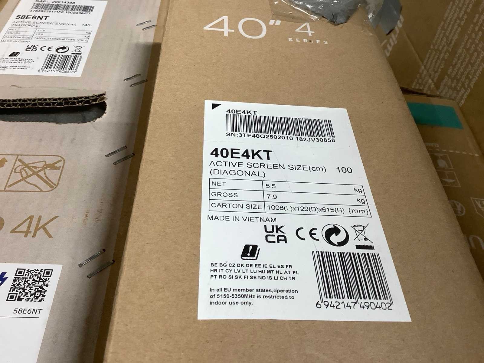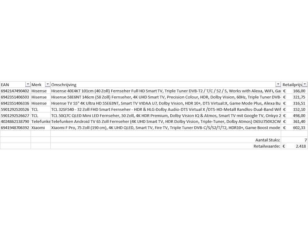 Dit betreft een partij televisies retourgoederen van een grote online retailer. De partij bestaat uit diverse diverse maten televisies. Aantal stuks: 7. Retailwaarde: €2418,- De televisies zijn niet werkend en zijn te gebruiken voor onderdelen. Kom op de kijkdag om te om zo een goed beeld te krijgen van de reden van retour. Zie foto's voor lijst met inhoud. Bezorgtermijn 14 dagen Merk: Pallet Retourgoederen - Televisies